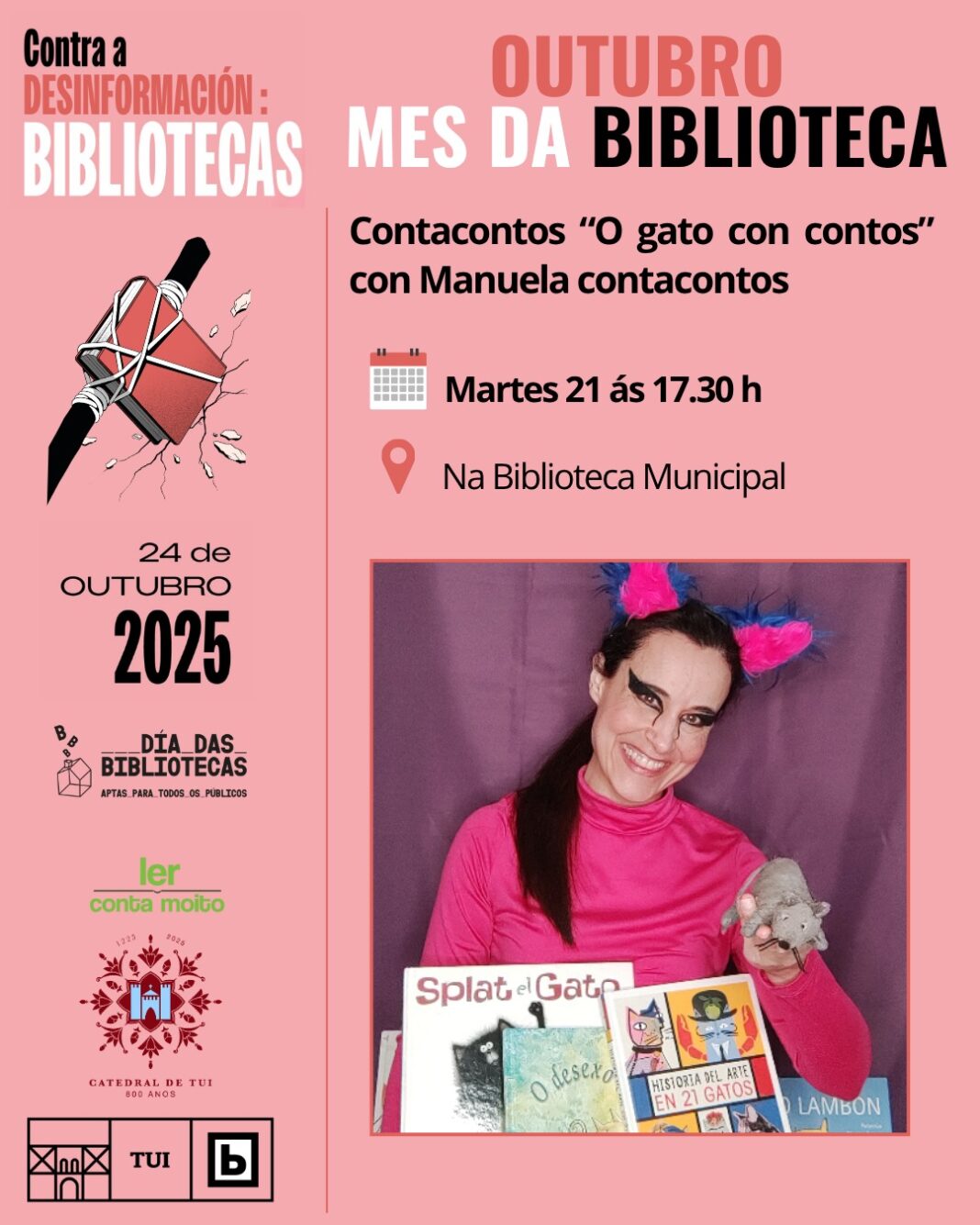 O próximo martes, 21 de outubro, continúan na Biblioteca Municipal de Tui as actividades do “Mes da Biblioteca”. Será ás 17.30 h  cunha sesión de contacontos, para nenos a partir de 5 anos, a cargo de Manuela contacontos que trae o espectáculo “O gato con contos” .