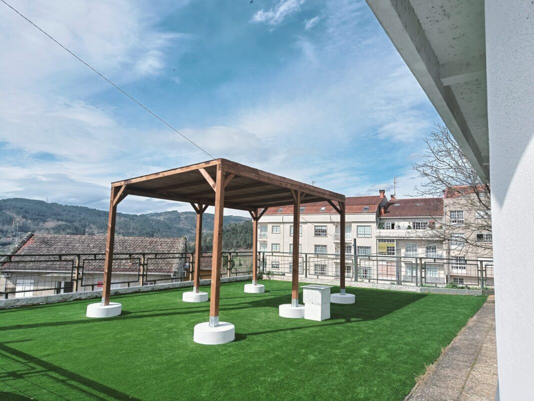 Na terraza da parte de atrás da biblioteca pública municipal a cidadanía conta agora cun espazo público no que o Concello acondicionou unha zona de lecer cunha pérgola de madeira e mobiliario que facilita o encontro social e o xogo nun espazo de todas e de todos.