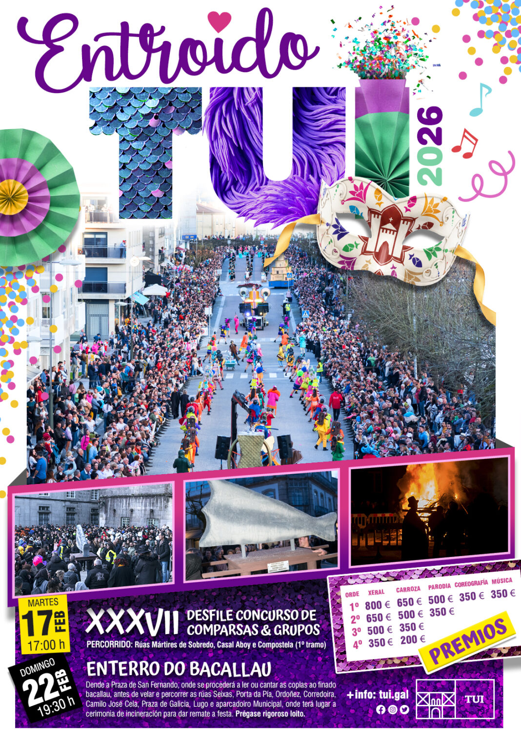 O cambio no percorrido é unha das principais novidades do Concurso-Desfile de Entroido en Tui que se vai celebrar o martes, 17 de febreiro ás 17 h. Hoxe mércores 28 de xaneiro publícanse no Boletín Oficial da Provincia de Pontevedra (BOPPO) as bases reguladoras e a convocatoria deste evento.