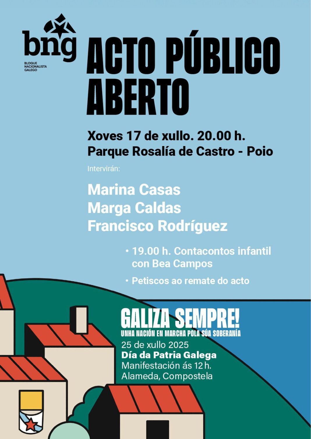 Dende o BNG de Poio convidan á participación da veciñanza para celebrar “o orgullo de ser galegas e galegos e de reivindicar a construción dun futuro mellor para Galiza”. O acto de mañá xoves no Parque Rosalía de Castro pretende ser unha xornada de convivio interxeracional xa que, ademais, comezará cun contacontos infantil con Bea Campos ás sete da tarde.