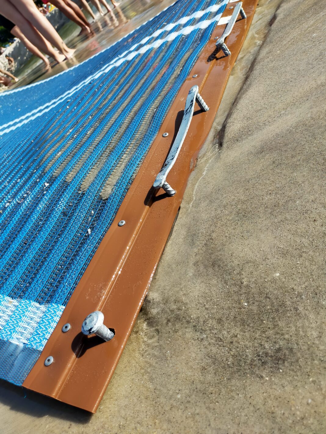A isto súmase que os ancoraxes situados ao final da pasarela sobresaen varios centímetros sobre o terreo, o que supón un risco evidente de tropezos para quen camiña pola beira da praia.