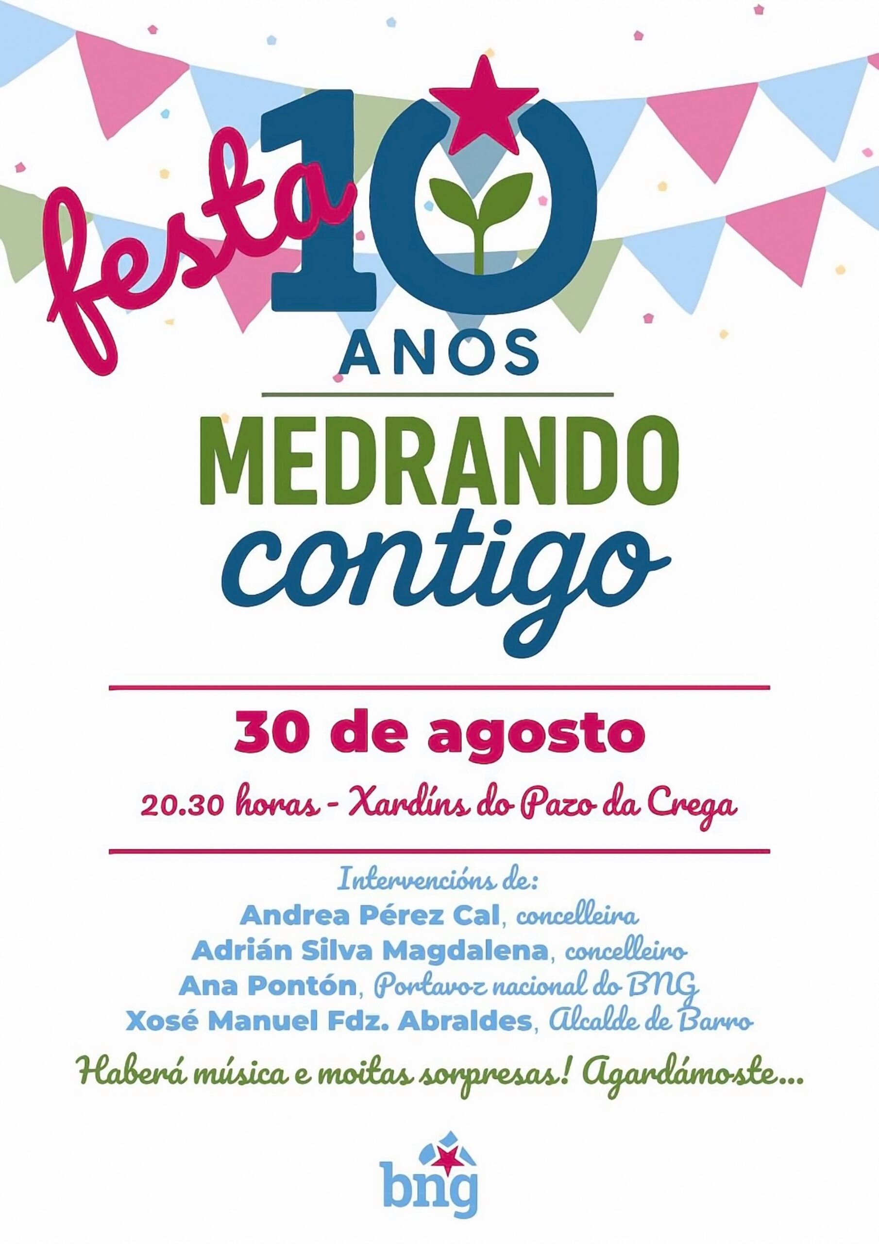 Para conmemorar este décimo aniversario, o BNG de Barro organiza unha festa de celebración baixo o lema “10 anos medrando contigo”., que terá lugar o vindeiro sábado 30 de agosto, ás 20:30 horas no Pazo da crego, e contará coa participación da concelleira Andrea Pérez Cal, o concelleiro Adrián Silva Magdalena, a portavoz nacional do BNG, Ana Pontón, e o alcalde de Barro, Xosé Manuel Fernández Abraldes.