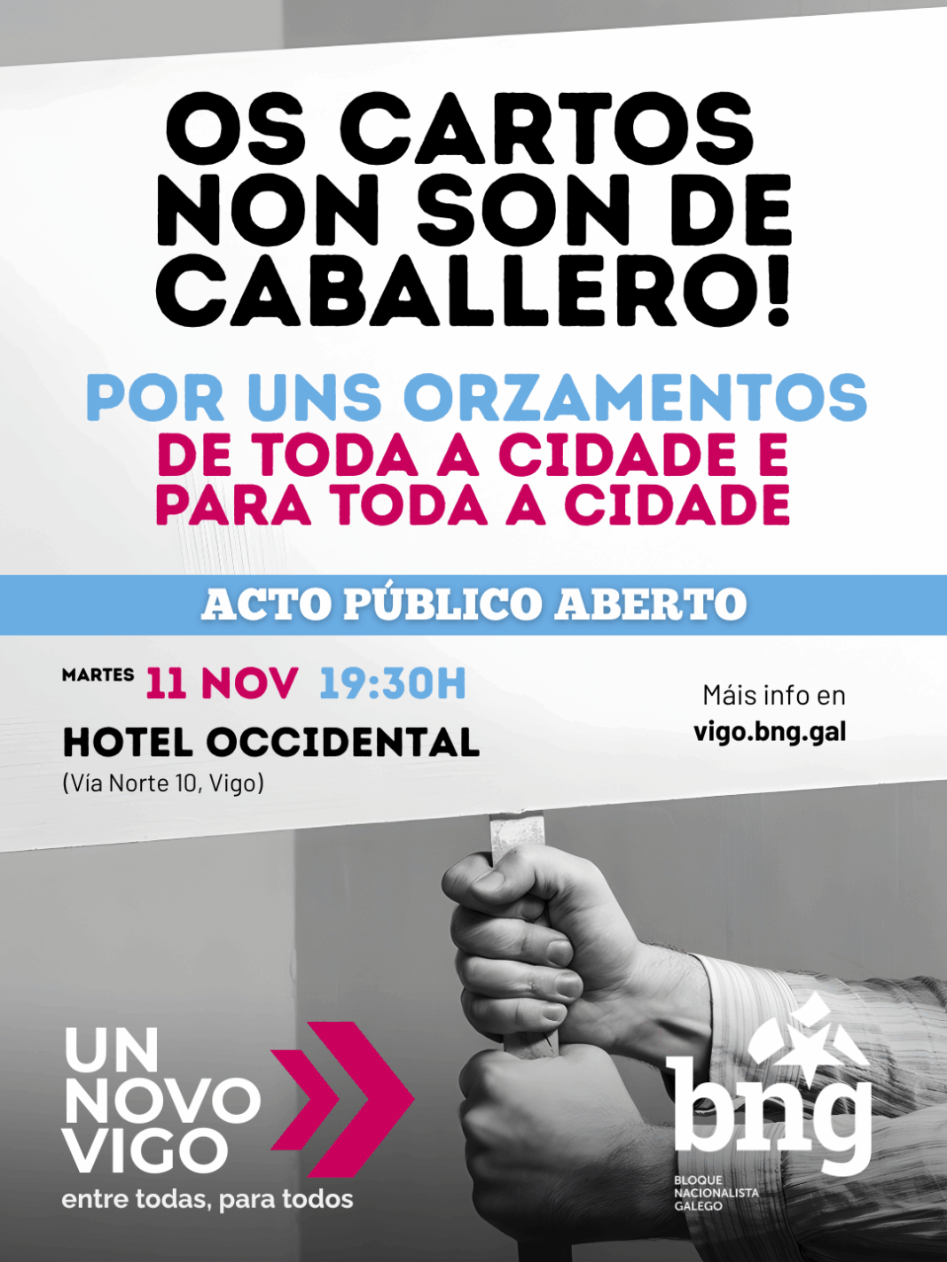 O Bloque Nacionalista Galego (BNG) convoca en Vigo un Encontro Aberto por uns Orzamentos Participativos. A fronte nacionalista organiza —este martes 11 de novembro, ás 19:30h, no Hotel Occidental (rúa Vía Norte 10) — un acto para trasladar as súas 198 alternativas ao proxecto de contas de Abel Caballero para o ano 2026 e seguir recollendo propostas da veciñanza e do tecido asociativo.
