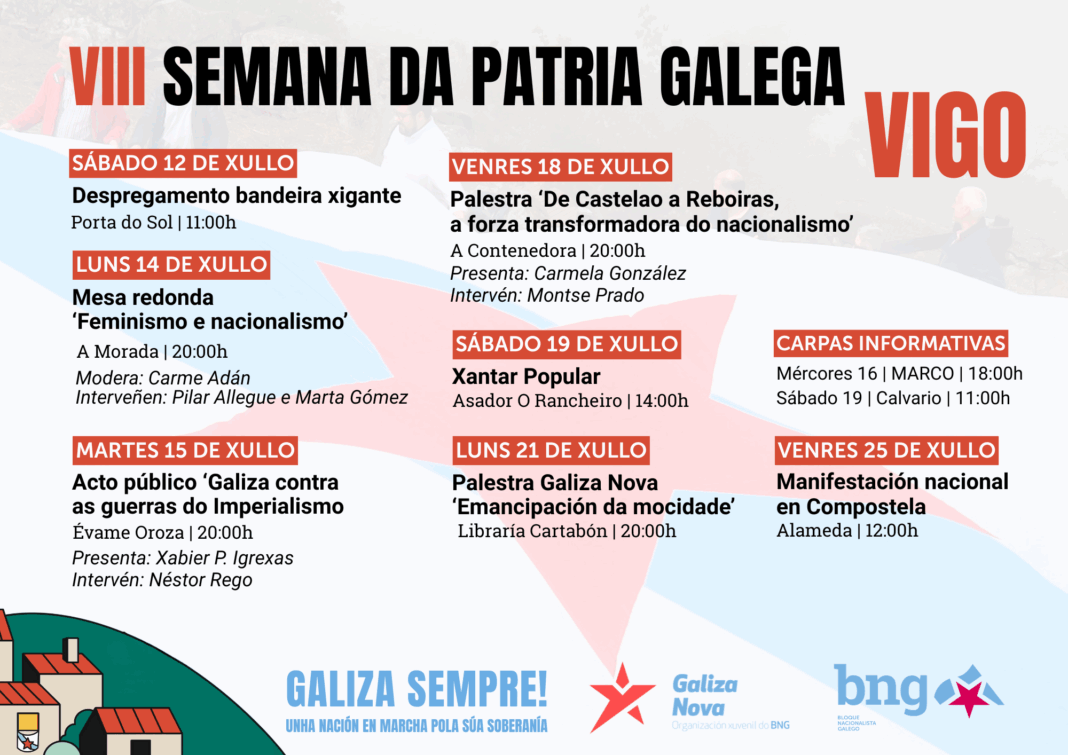 O Bloque Nacionalista Galego (BNG) de Vigo vén de iniciar este sábado a VIII Semana da Patria Galega coa despregadura dunha bandeira xigante de Galiza na Porta do Sol. A fronte nacionalista presenta unha ampla programación, xunto á organización xuvenil Galiza Nova, que inclúe un acto político co portavoz do BNG no Congreso, Néstor Rego, actividades culturais e palestras para quentar motores cara ao Día da Patria e a manifestación nacional en Compostela o 25 de xullo.