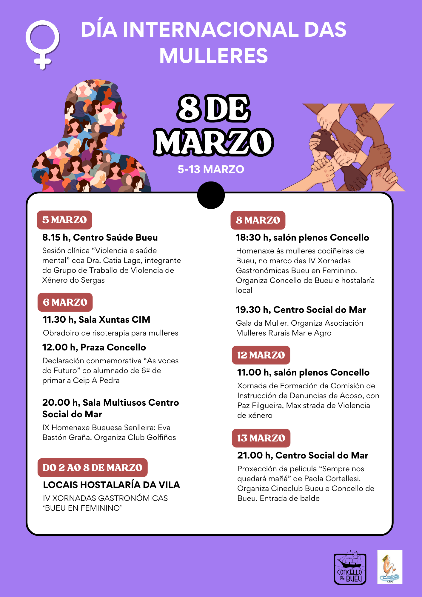 O Concello de Bueu presenta a programación con motivo do 8 de marzo, Día Internacional das Mulleres, que incluirá unha declaración a cargo do alumnado do CEIP A Pedra, sesións formativas, cine, IV Xornadas Gastronómicas En Feminino Bueu e outras propostas que porán o foco na necesidade dunha sociedade máis xusta e igualitaria.