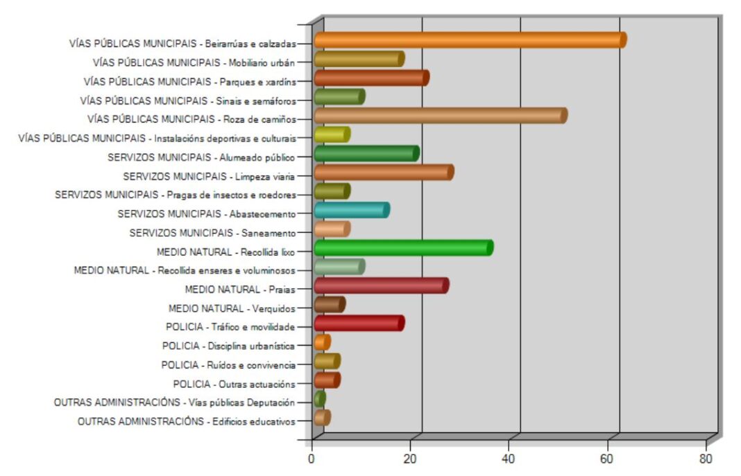 De entre os avisos máis recorrentes están os puntos de luz que non funcionan ou nos que falta a luz, beirarrúas que se atopan con baldosas en mal estado, camiños ou viais nos que se precisa a roza e limpeza de vexetación, problemas cos servizos de auga, avarías nos xogos dos parques ou outras instalacións municipais, problemas nas praias e parques etc. Así mesmo, dende a aplicación tamén se dispón de opcións para que se poidan comunicar incidencias de espazos doutras administracións, caso da Xunta de Galicia, Deputación de Pontevedra, Costas do Estado ou Portos de Galicia, as cales son trasladadas dende o Concello aos organismos competentes.