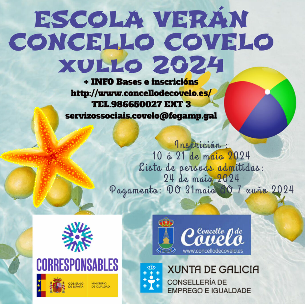 O Concello de Covelo informa que dende hoxe día 10 ata o vindeiro día 21 de maio estará aberto o prazo de inscrición para participar na Escola de Verán que organiza o Concello da man do programa Corresponsables do Ministerio de Igualdade do estado español e da Consellería de Emprego e Igualdade da Xunta de Galicia. A Escola de Verán desenvolverase en horario de 08.00-14.00 horas, de luns a venres, dende o día 3 ó 31 de xullo de 2024