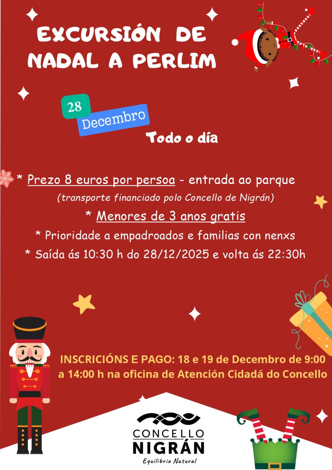 O Concello de Nigrán ofrece un ano máis unha excursión ao parque temático de Nadal máis grande de Portugal, Perlim, o domigo 28 de decembro e a un prezo popular de 8 €/persoa (os menores de 3 anos non pagan). A inscrición será o xoves 18 e venres 19 de 9:00 a 14:00 horas na Oficina de Información do Concello de Nigrán estando limitada a 100 prazas que seguirán unha rigorosa orde de inscrición, sempre con prioridade para os empadroados en Nigrán e familias con crianzas. O prezo é de 8 en concepto de entrada ao parque, xa que o Concello sufraga o transporte. A hora prevista de saída é as 10:30 horas e a de chegada ás 22:30 horas.