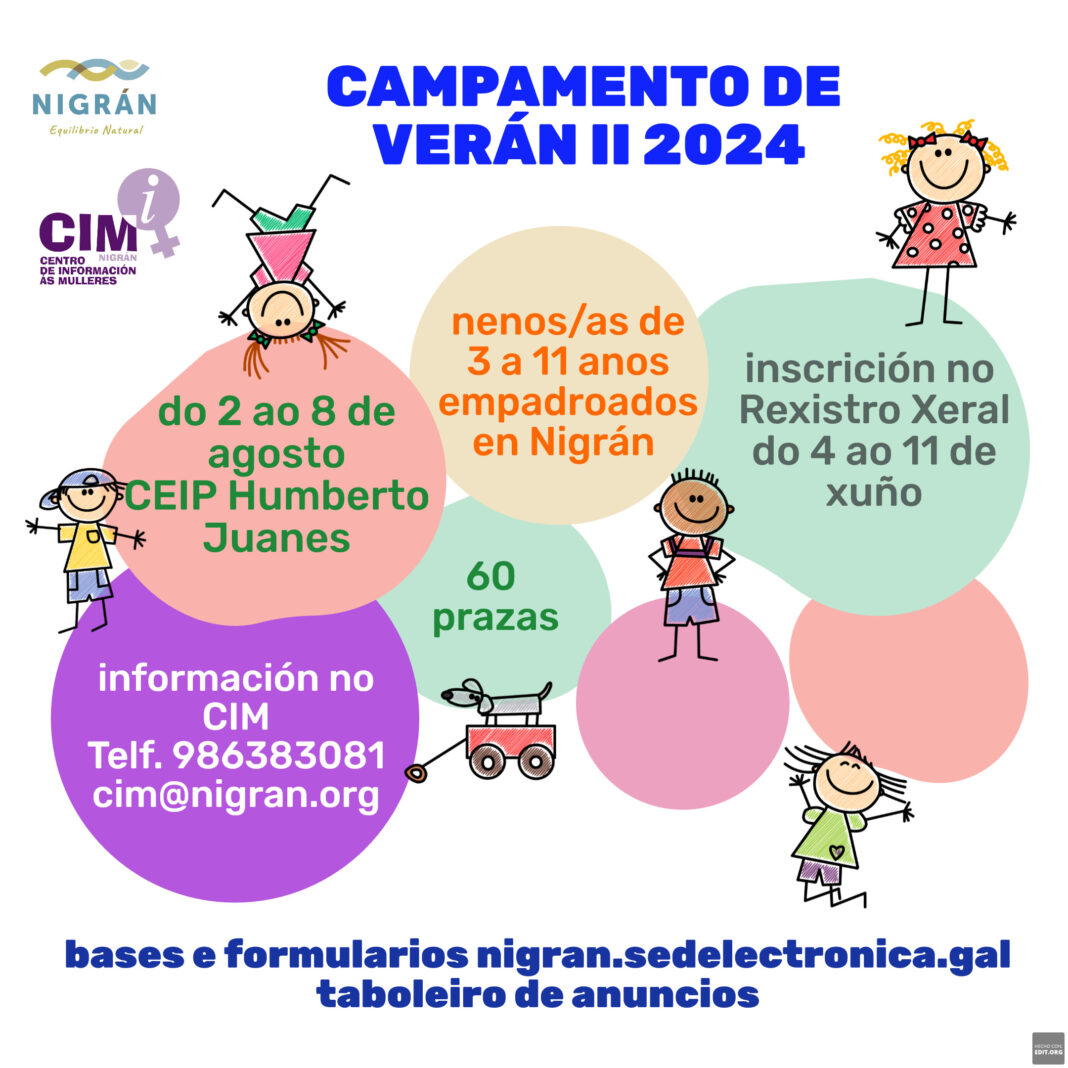 Este novo ‘Campamento de Verán II 2024’ organizado a través do Centro de Información ás Mulleres (CIM) ten tamén como obxectivo favorecer a conciliación da vida laboral, persoal e familiar da veciñanza. O campamento dispón de 60 prazas e está destinado a nenos e nenas empadroados en Nigrán con idades comprendidas entre os 3 e 11 anos, desenvolvéndose desde o día 2 de agosto ata o día 30 de agosto, de luns a venres, no CEIP Humberto Juanes. O período de inscrición comeza o día 4 de xuño e finaliza o día 11 de xuño e os devanditos formularios e as propias bases poden recollerse no Centro de Información ás Mulleres, na Oficina de Atención Cidadá do Concello ou descargarse no taboleiro de anuncios (nigran.sedelectronica.gal / Tabolerio de anuncios).