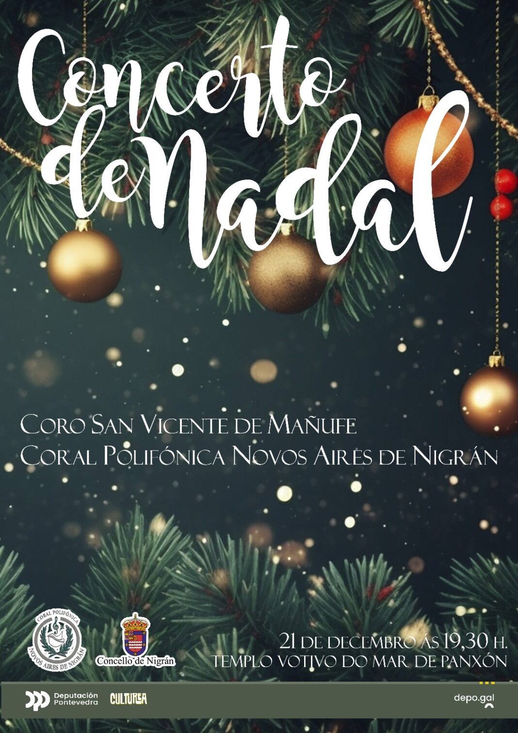 O Templo Votivo de Panxón acolle este sábado 21 de decembro ás 19:30 horas un concerto de Nadal a cargo da coral anfitriona Novos Aires de Nigrán e a gondomareña de San Vicente de Mañufe. Cada unha delas interpretará sete temas e, conxuntamente, ‘No la debemos dormir’ e o ‘Adeste Fideles’. Os asistentes poderán gozar de panxoliñas clásicas como ‘El tamborilero’, ‘Campanitas de Navidad’, ‘Noche de Paz’ o ‘Jesús Redentor’.