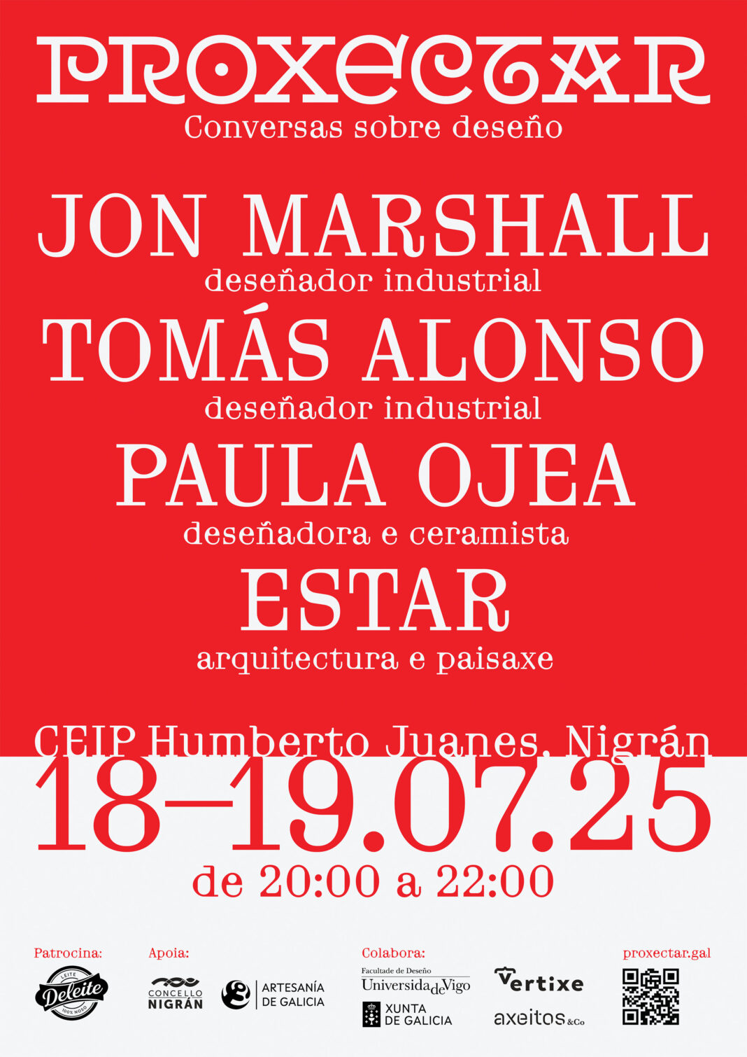 O Concello de Nigrán acolle os días 18 e 19 de xullo a primeira edición de ‘Proxectar’, un ciclo de conversas sobre deseño industrial que pon en valor os procesos creativos detrás do deseño de produto, ofrecendo un espazo único para compartir metodoloxías, experiencias e coñecemento. A cita, que terá lugar no CEIP Humberto Juanes, conta cun cartel de primeiro nivel, con nomes como o recoñecido deseñador británico Jon Marshall, socio da axencial internacional de deseño Pentagram; o galego Tomás Alonso, colaborador de firmas como Hermès ou Camper; a ceramista nigranesa e deseñadora Paula Ojea, Premio Nacional de Artesanía; ou o estudo compostelán Estar, especializado en arquitectura e paisaxe e que vén de estar presente na Bienal de Venecia.