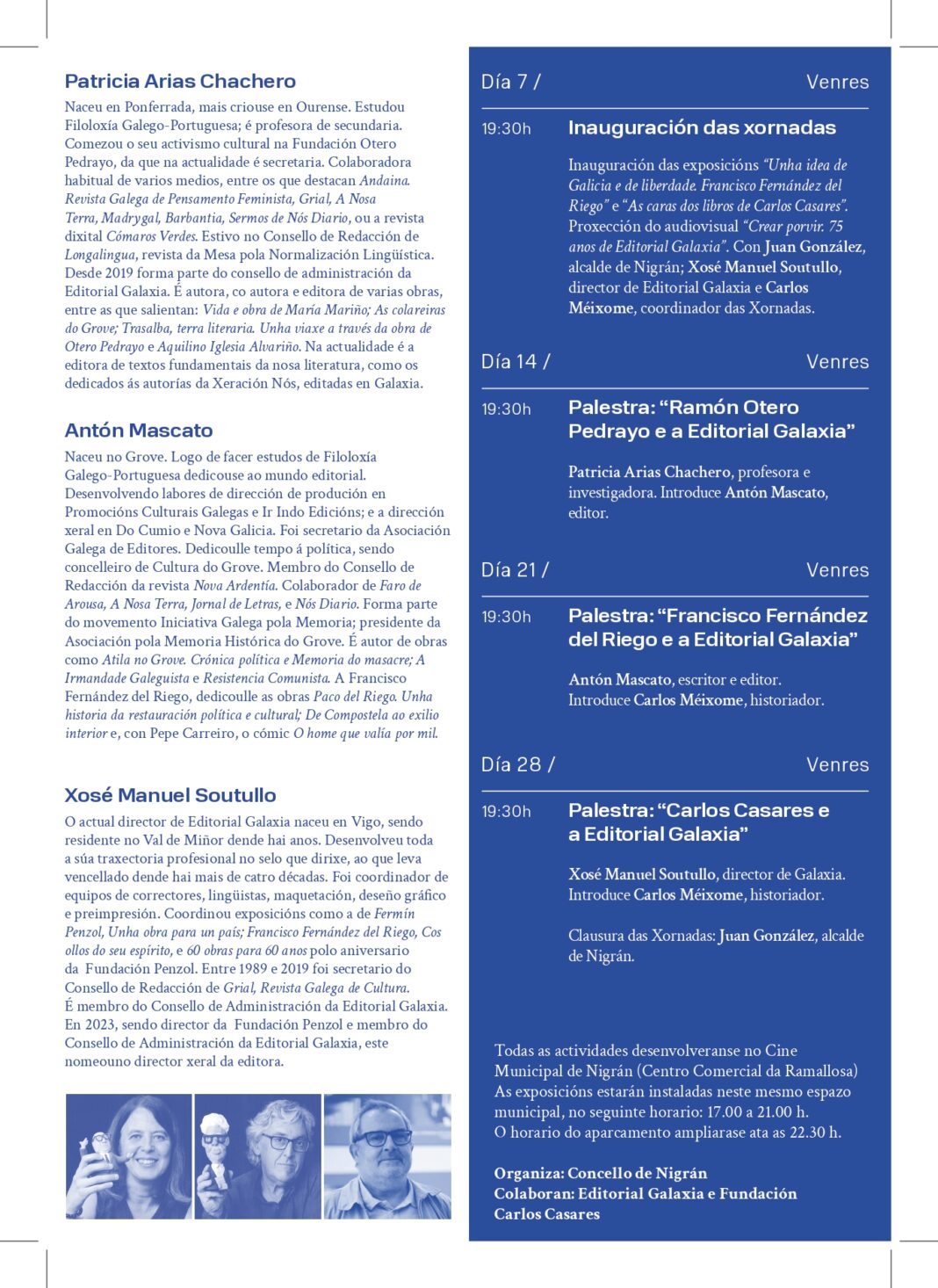 O Concello de Nigrán celebrará ao longo do mes de Novembro os 75 anos da Editorial Galaxia, e o fará con xornadas todos os venres nos Cines Municipáis do Centro Comercial A Ramallosa. A primeira, este mesmo día 7, arrancará ás 19:30 horas coa inauguración das exposicións ‘Unha idea de Galicia e de liberdade. Francisco Fernández del Riego’ e ‘As caras dos libros de Carlos Casares’ (poderanse visitar ate o día 30 de 17:00 a 21:00 horas). Ademais, proxectarase o audiovisual ‘Crear porvir. 75 anos de Editorial Galaxia’, presentado por Juan González, alcalde de Nigrán; Xosé Manuel Soutullo, director da editorial, e Carlos Méixome, coordinador do evento.