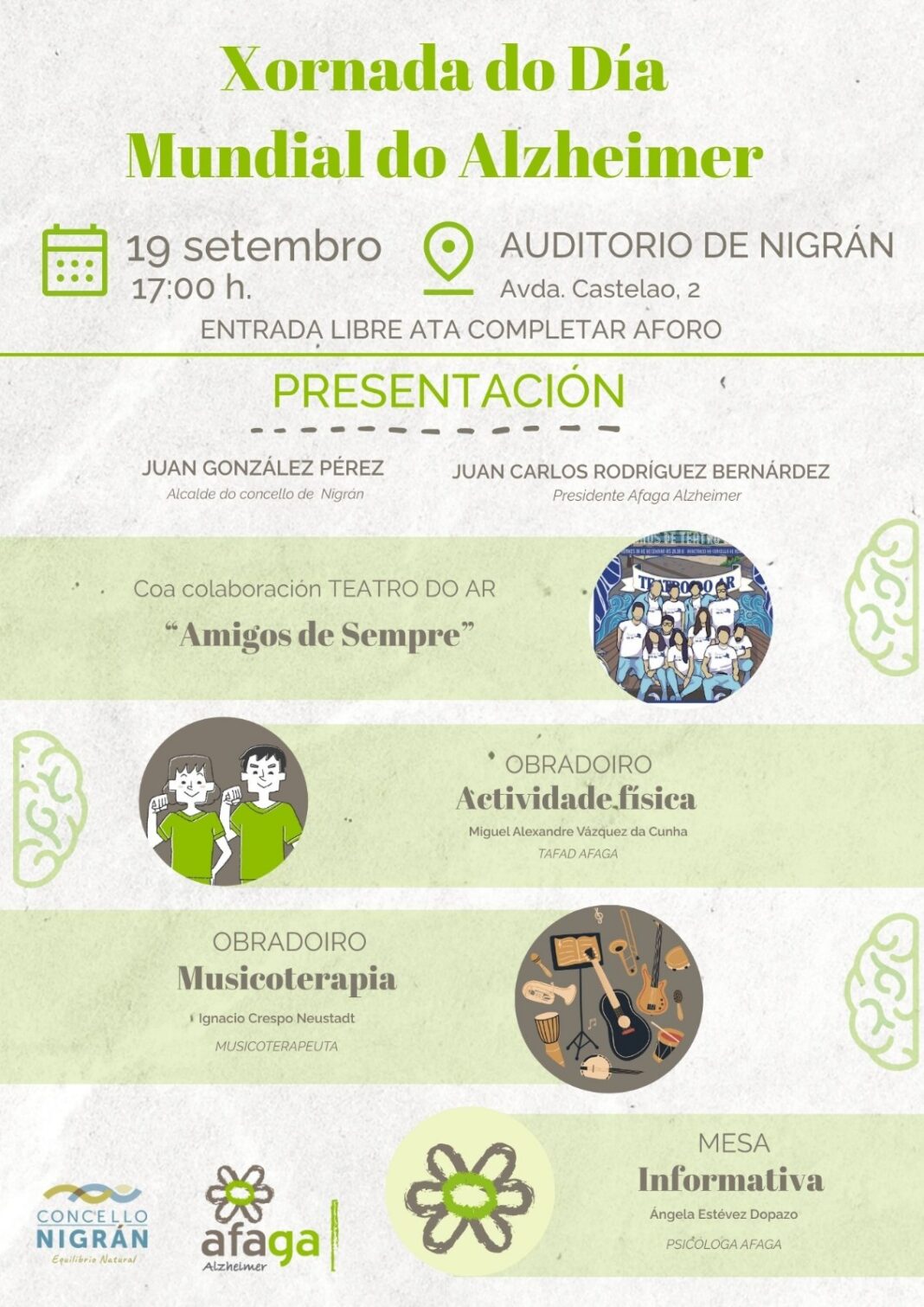O alcalde de Nigrán, Juan González, e o presidente de AFAGA Alzheimer, Juan Carlos Bernárdez, serán os encargados de inaugurar as xornadas para, a continuación, Teatro do Ar ofrecer a representación ‘Amigos de Sempre’, unha obra na que se aborda o proceso desta enfermidade. Despois, Miguel Alexandre Vázquez, técnico superior en actividades físicas e deportivas, dirixirá un obradoiro ao respecto e, finalmente, Ignacio Crespo Neustadt impartirá un obradoiro de musicoterapia, achegando aos asistentes a este enfoque terapéutico non farmacolóxico que utiliza a música para estimular a memoria e as conexións sociais en persoas con Alzheimer. A psicóloga Ángela Estévez Dopazo estará toda a tarde na mesa informativa responden a todas as cuestións que se lle plantexen.