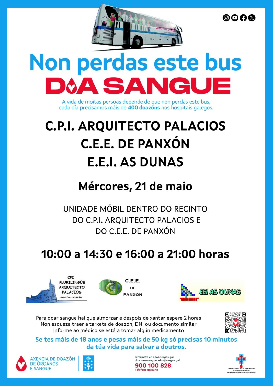 A comunidade educativa de Panxón (formada polo CPI Arquitecto Palacios, Escola Infantil As Dunas e C.E.E de Panxón) realizarán por terceiro ano consecutivo este mércores 21 de maio a súa campaña solidaria de doazón de sangue co reto de acadar os 50 doantes, unha por cada ano de existencia do centro. Con este propósito, o Concello de Nigrán colabora para que esté no recinto escolar (camiño dos Lagos s/n) unha unidade móbil de 10:00 a 14:30 e de 16:00 a 21:00 horas.