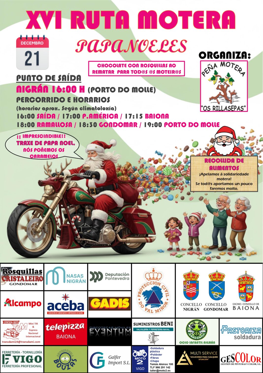 Ao longo do percorrido repartiranse caramelos, que serán facilitados pola organización, e ao finalizar, haberá unha chocolatada con rosquillas Cristaleiro para todos os moteiros. Como é habitual, recolleranse alimentos non perecedoiros no punto de quedada.