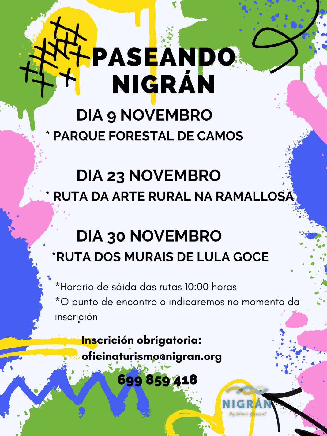 O Concello de Nigrán continua este sábado 9 de novembro co programa ‘Paseando Nigrán’ cun roteiro polo parque forestal Os Matos-Río Táboas. O seguinte será o sábado 23 de novembro pola arte rural da Ramallosa e o sábado 30 será polos murais de Lula Goce . Todas as saídas son ás 10:00 horas e é imprescindible realizar inscrición previa en oficinaturismo@nigran.org, que será cando se facilite o punto de encontro. Para máis información, as persoas interesadas poden contactar no teléfono 699859418.