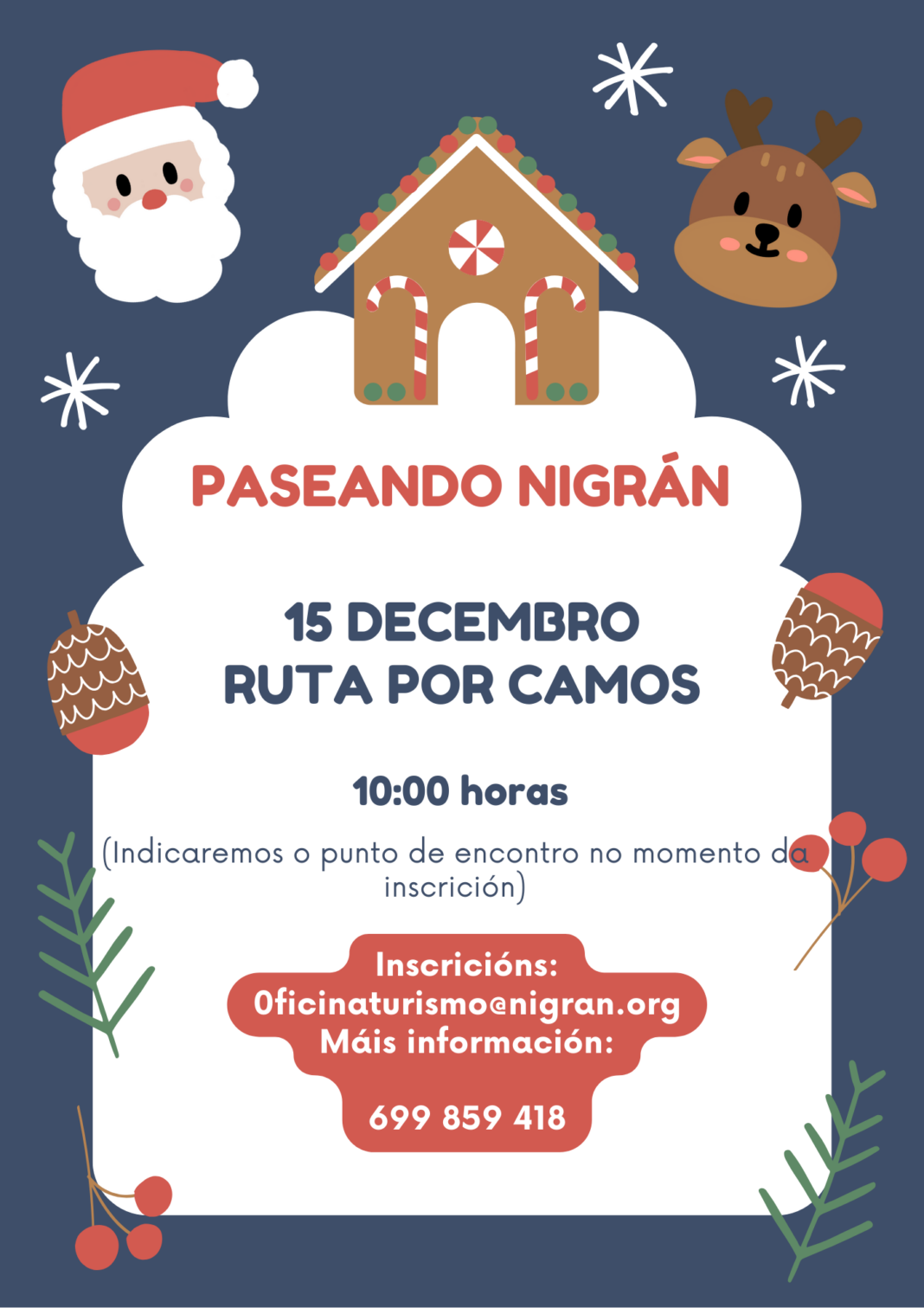 O Concello de Nigrán continua este sábado 9 de novembro co programa ‘Paseando Nigrán’ cun roteiro polo parque forestal Os Matos-Río Táboas. O seguinte será o sábado 23 de novembro pola arte rural da Ramallosa e o sábado 30 será polos murais de Lula Goce . Todas as saídas son ás 10:00 horas e é imprescindible realizar inscrición previa en oficinaturismo@nigran.org, que será cando se facilite o punto de encontro. Para máis información, as persoas interesadas poden contactar no teléfono 699859418.