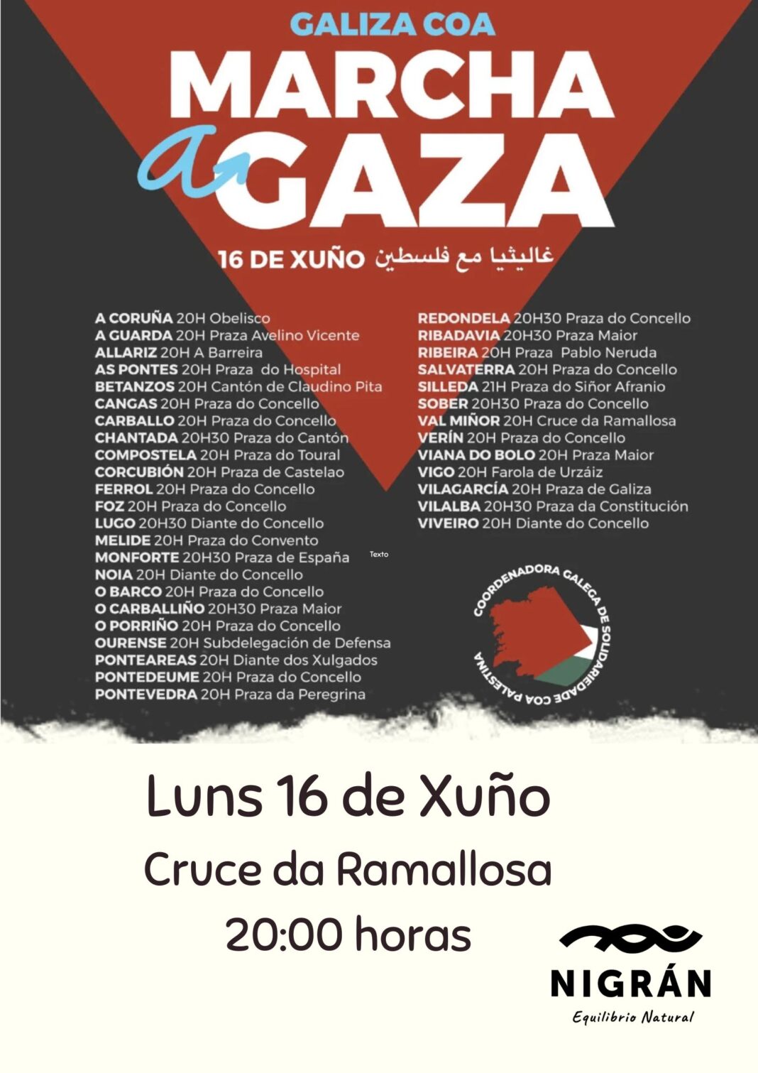 Nigrán, 16/06/25.- O Concello de Nigrán chama á veciñanza a participar este luns 16 de xuño ás 20:00 horas na concentración no cruce da Ramallosa ‘Galicia coa marcha a Gaza’. Baixo este lema a Coordenadora Galega de Solidariedade con Palestina convoca concentracións en vilas e cidades de toda a comunidade e o Concello de Nigrán súmase novamente.