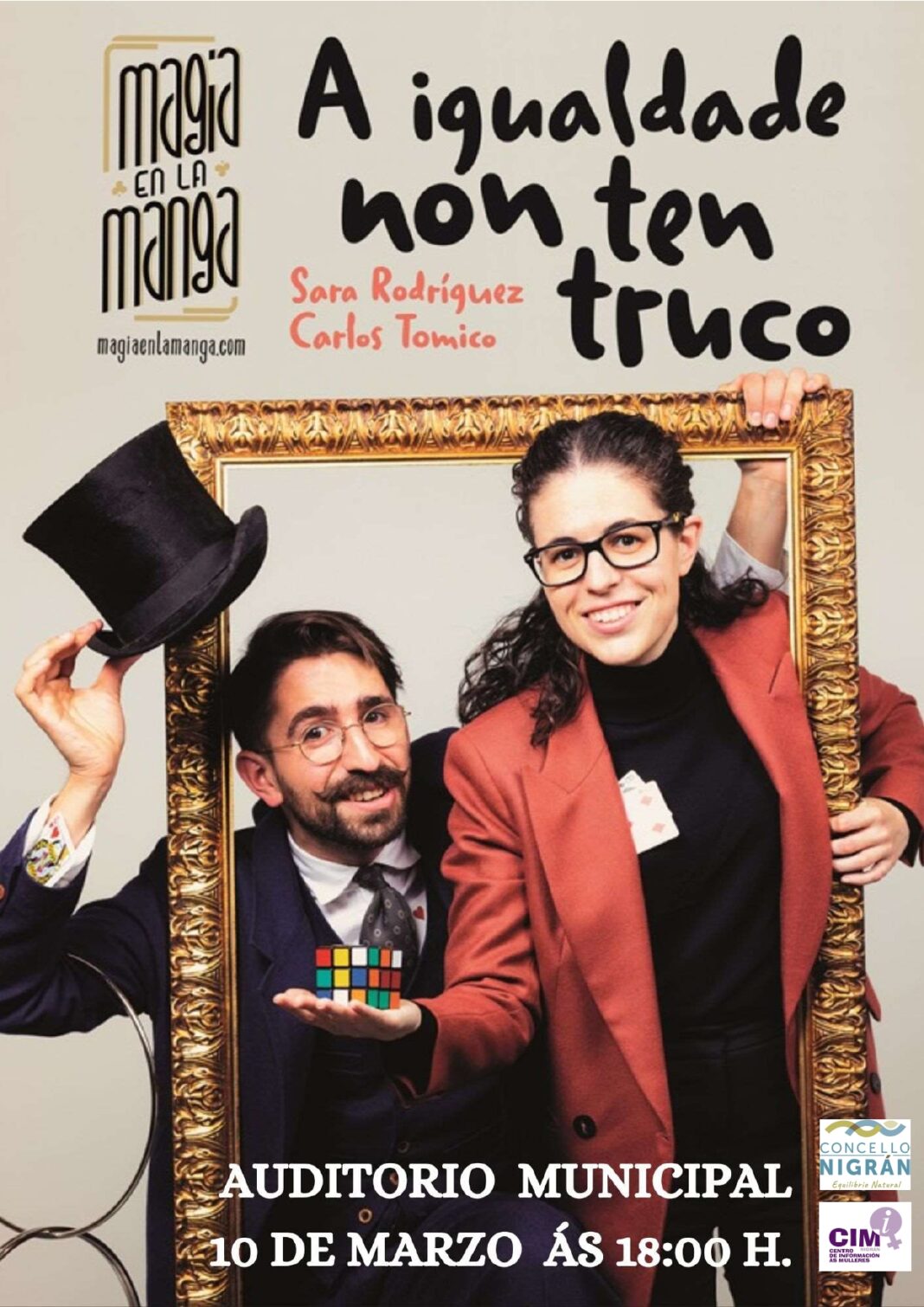 O domingo 10 de marzo a partir das 18:00 horas será o momento da maxia no Auditorio Municipal de Nigrán da man da compañía viguesa ‘Magia en la manga’. Por que hai máis ‘magos’ que ‘magas’? É certo que estamos afeitos ver magos, pero tamén existiron e existen hoxe moitas mulleres magas. ‘A igualdade non ten truco’ é un espectáculo divertido e máxico para todos os públicos que transmite ademais unha mensaxe esencial para a sociedade actual: promover a igualdade de xénero a través da arte do ilusionismo e das vivencias das mulleres ilusionistas. Unha maga e un mago forman este dúo máxico para realizar misterios e imposibles que ademais nos levarán por diferentes ideas e conceptos do feminismo e da igualdade de xénero. Viaxes e transformacións inexplicables, un conto de fadas reinventado ou unha volta atrás no tempo á época das primeiras e máis importantes meigas; son algúns exemplos que se poderán ver neste espectáculo cheo de sorpresas ata o final onde nada é o que parece. Unha aventura máxica para toda a familia na que se descubriá que, efectivamente, a igualdade de xénero non ten truco ningún.