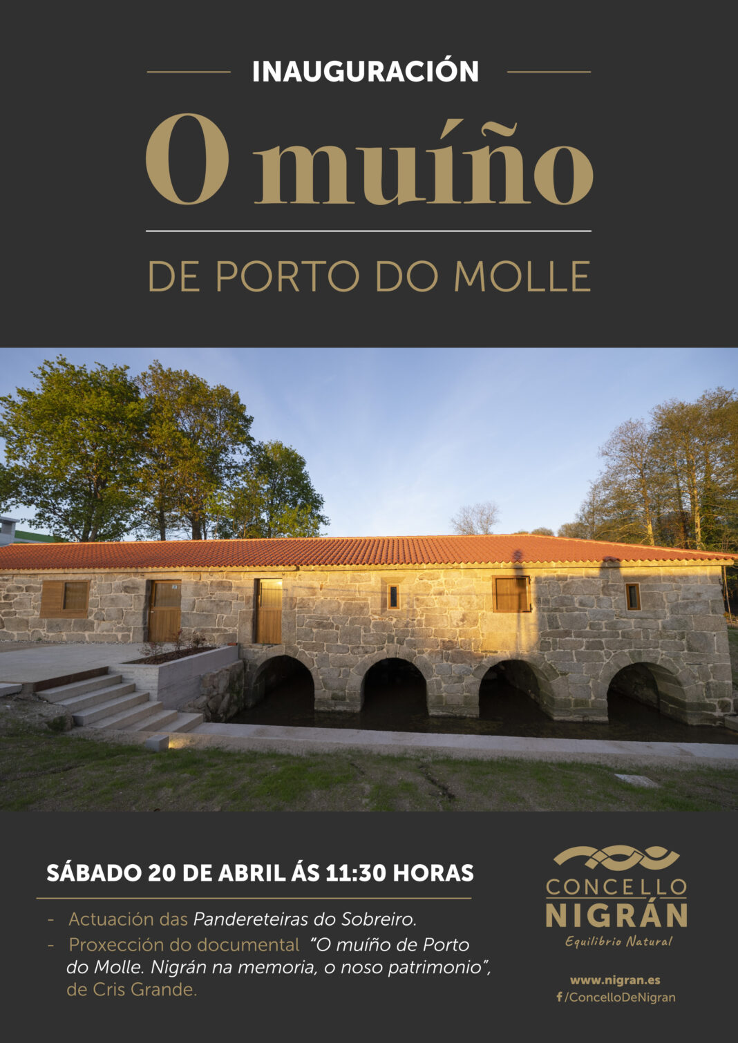 O Concello de Nigrán inaugurará este sábado 20 de abril a partir das 11:30 horas o rehabilitado muíño de Porto do Molle (situado en pleno parque empresarial) cunha gran muiñada popular. A festa, aberta a toda a veciñanza, terá lugar a partir das 11:30 horas coa presenza das miñoranas ‘Pandereteiras do Sobreiro’ (que compuxeron un tema ex-profeso para a ocasión) a proxección da curta documental sobre a historia deste muíño e o seu proceso de reconstrucción (realizado por Cris Grande para o Arquivo Histórico Audiovisual de Nigrán) e, finalmente, a posta en funcionamento da moa. A Asociación de Festas Santiago e Santa Ana 2023/24, de Parada, servirá chouripáns.