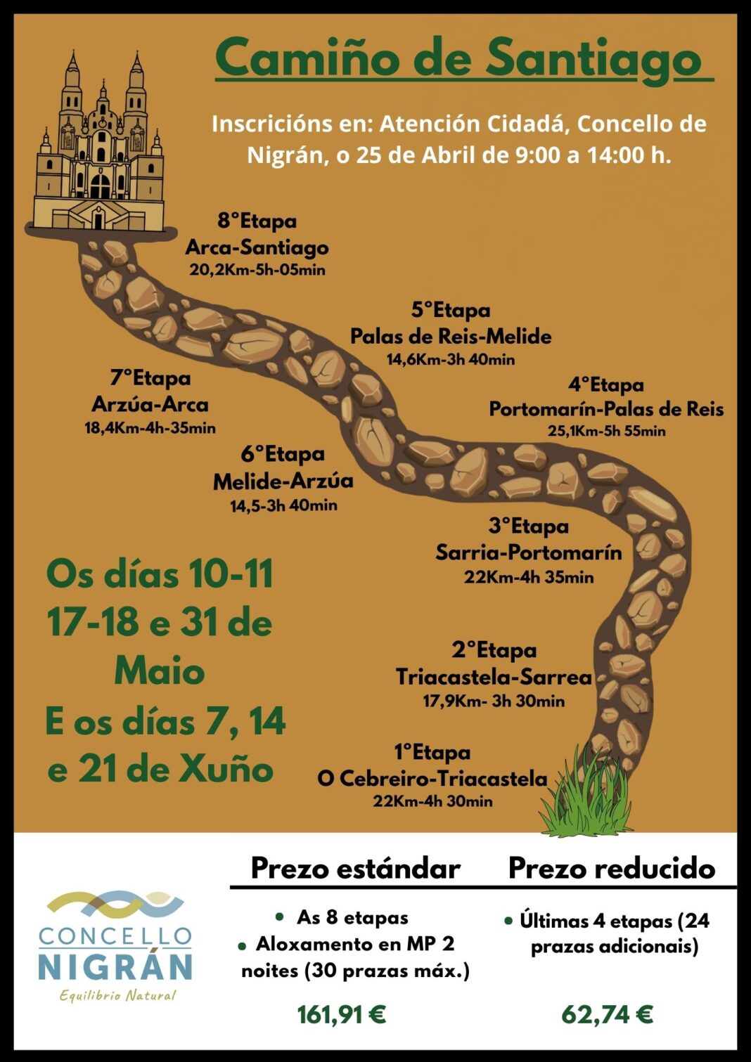 O Concello de Nigrán mantén aberto o prazo de inscrición ata este luns 28 de abril na Oficina de Información Cidadá para participar na realización do Camiño de Santiago desde O Cebreiro a Compostela en oito etapas ao quedar hoxe prazas libres. As catro primeiras etapas son facendo noite en réxime de media pensión en habitación dobre e as outras catro con ida e volta desde Nigrán. Desenvolveranse os días 10 e 11 de maio, 17 e 18 de maio (neste caso facendo noite) e os días 7, 14 e 21 de xuño. O prezo estándar para o Camiño completo é de 161,91 € (máximo 30 prazas) e para os que queiran facer só as derradeiras 4 etapas con ida e volta desde Nigrán cada día en autobús é de 62,74 € (54 prazas para esta opción). Cada etapa percorre unha distancia de entre 15 de 22 km e os participantes deberán levar a súa comida. A viaxe inclúe transporte en autobús ida e volta, guía acompañante, seguro e, no caso das catro primeiras etapas o aloxamento en media pensión.