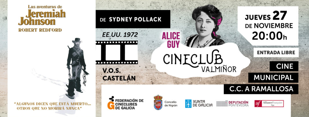 O Concello de Nigrán ofrece este xoves 27 de novembro ás 20:00 horas nos Cines Municipais do Centro Comercial A Ramallosa e a través do Cineclub Val Miñor Alice Guy a película ‘Las aventuras de Jeremiah Johnson’ , protagonizada por Robert Reford e dirixida por Sydney Pollack. Está considerada pola crítica como unha obra mestra e un dos mellores westerns da Historia. Posteriormente haberá un coloquio a cargo do profesor Alfonso Castaño. A entrada é de balde ata completar o aforo. O cineclub proxecta películas todos os últimos xoves de mes ás 20:00 horas, mentres que o resto de filmes que ofrece os xoves e os sábados o Concello son ás 18:00 horas.