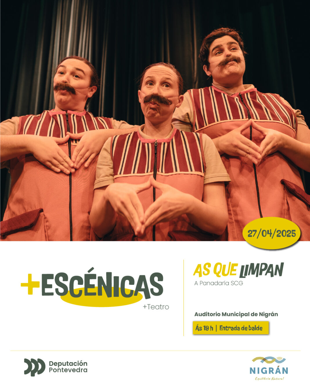 O Concello de Nigrán ofrece este domingo 27 de abril ás 19:00 horas no Auditorio Municipal o premiadísimo espectáculo satírico ‘As que Limpan’, da compañía viguesa ‘A Panadaría’. A entrada é de balde ata completar o aforo e a función se encadra no circuíto ‘+Escénicas’ da Deputación de Pontevedra.