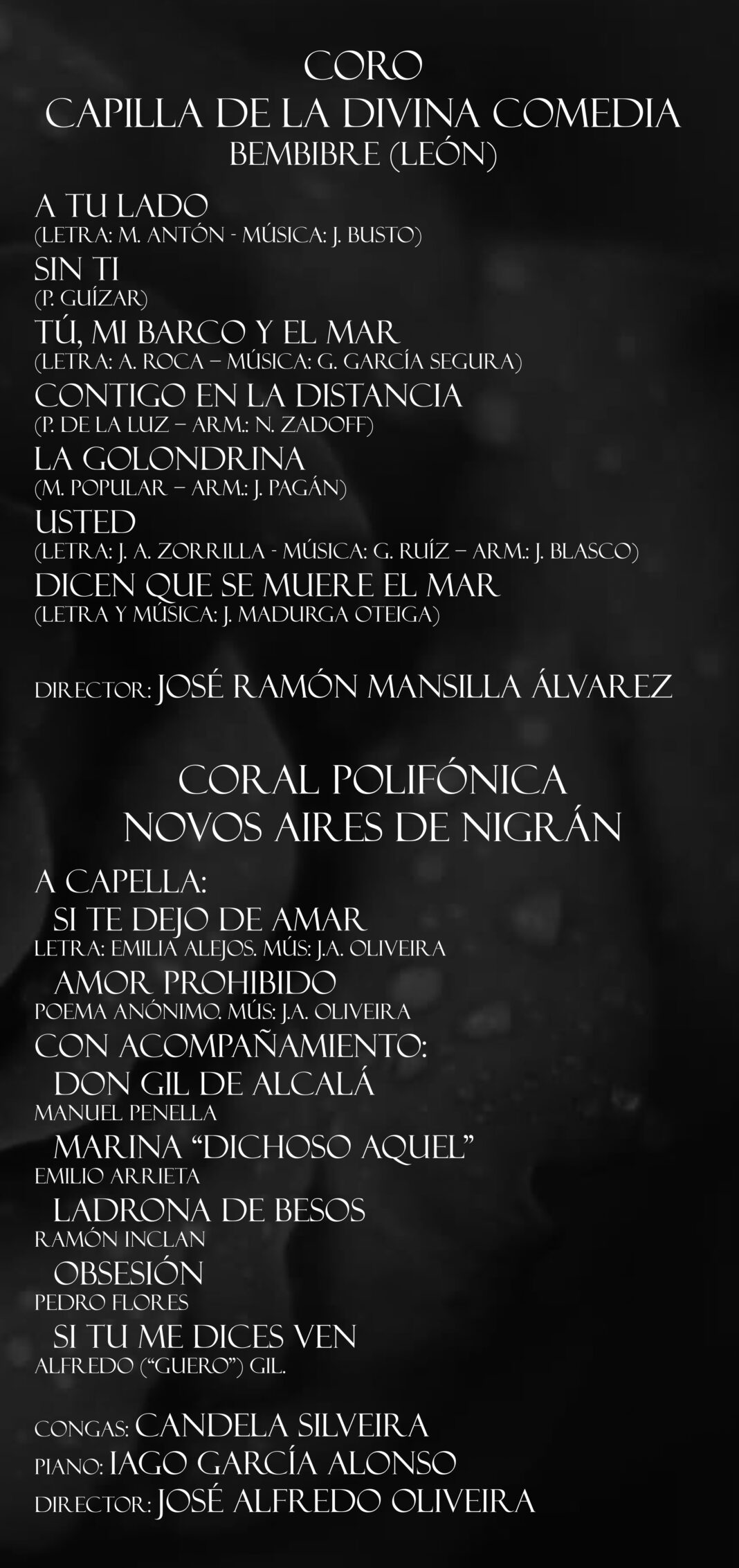 O festival arrancará co coro invitado baixo a batuta do seu director José Ramón Mansilla, interpretando un total de sete temas entre os que se atopa ‘A tu lado’, ‘Sin ti’ ou ‘Usted’. A continuación subirá ao escenario a Coral Polifónica Novos Aires de Nigrán con José Alfredo Oliveira ao frente, Candela Silveira nas congas e Iago García ao piano. Interpretarán un total de 8 temas, dous deles a capela (‘Si te dejo de amar’ e ‘Amor prohibido’) e cinco con este acompañamento musical, entre elas ‘Obsesión’ ou ‘Si tu me dices ven’.