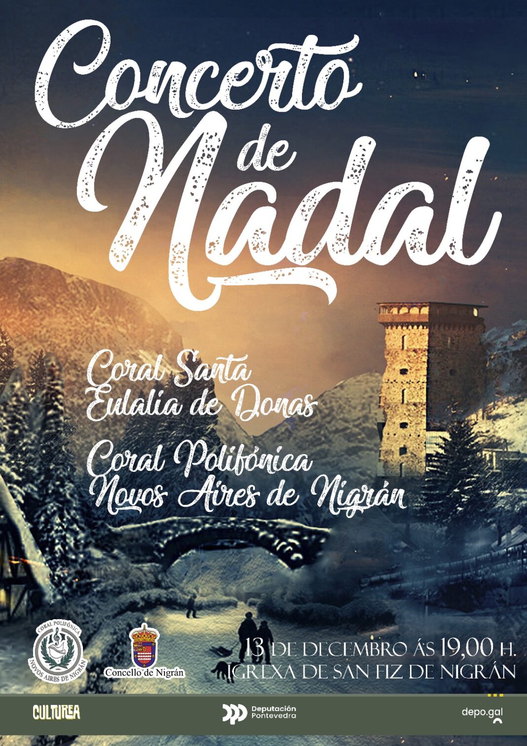 O Concello de Nigrán, dentro da súa programacion especial de Nadal, ofrece este sábado 13 de decembro ás 19:00 horas na Igrexa de San Fiz (rua da Igrexa, 10, O Ceán) un concerto especial da Nadal a cargo da coral Santa Eulalia de Donas e Coral Polifónica Novos Aires de Nigrán. Ambas formacións interpretarán as panxoliñas máis clásicas desta época.