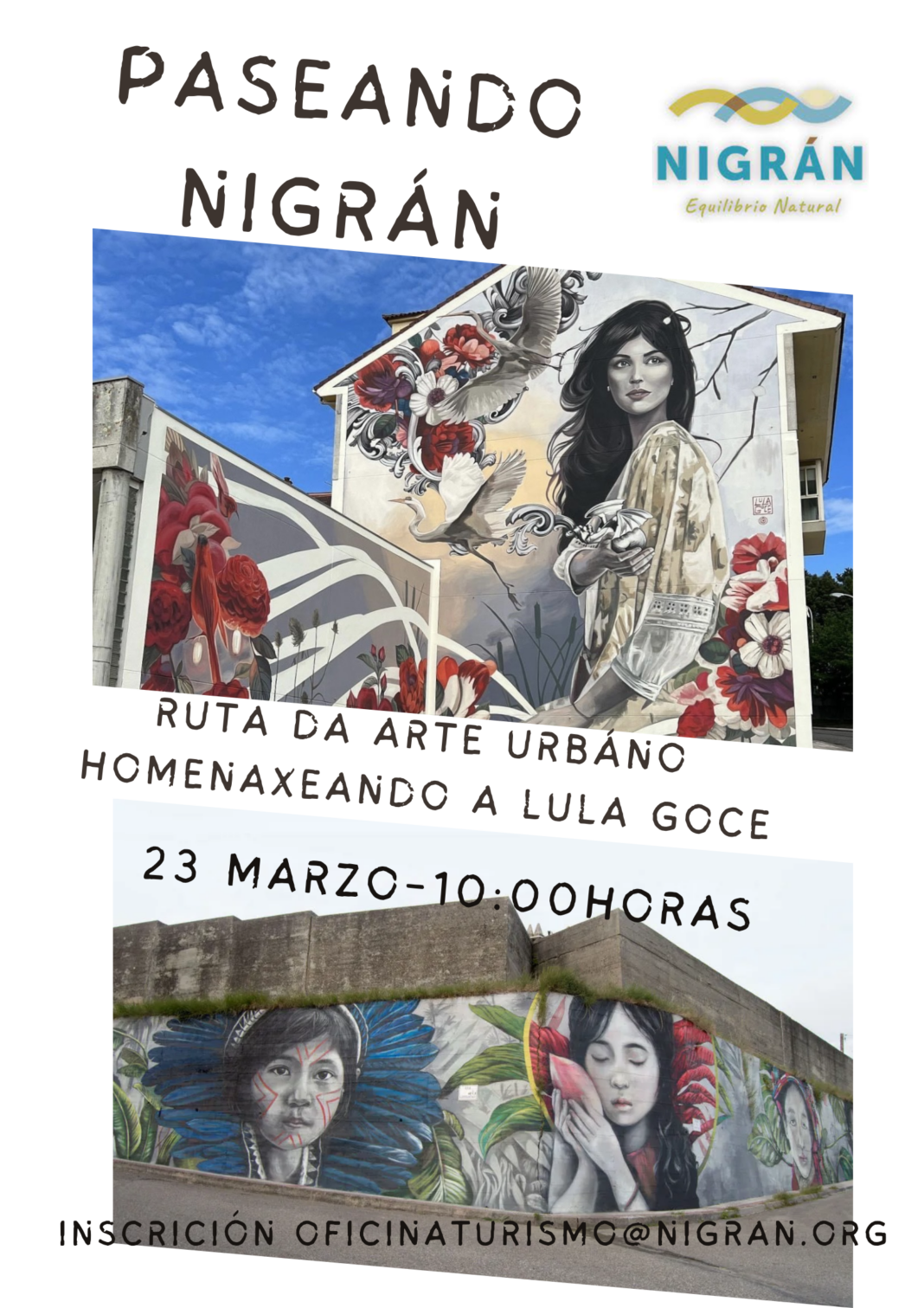 O Concello de Nigrán ofrece este sábado 23 de marzo desde as 10:00 horas un roteiro gratuíto polos murais da artista Lula Goce no municipio, unha saída encadrada no programa de paseos saudabeis iniciado no 2022 polo Concello e que consiste en camiñatas guiadas de dificultade baixa por lugares da localidade cun especial atractivo cultural ou natural. Os interesados deben inscribirse a través do mail oficinaturismo@nigran.org . Para resolver dúbidas ou máis cuestións: oficinaturismo@nigran.org / 699 859 418