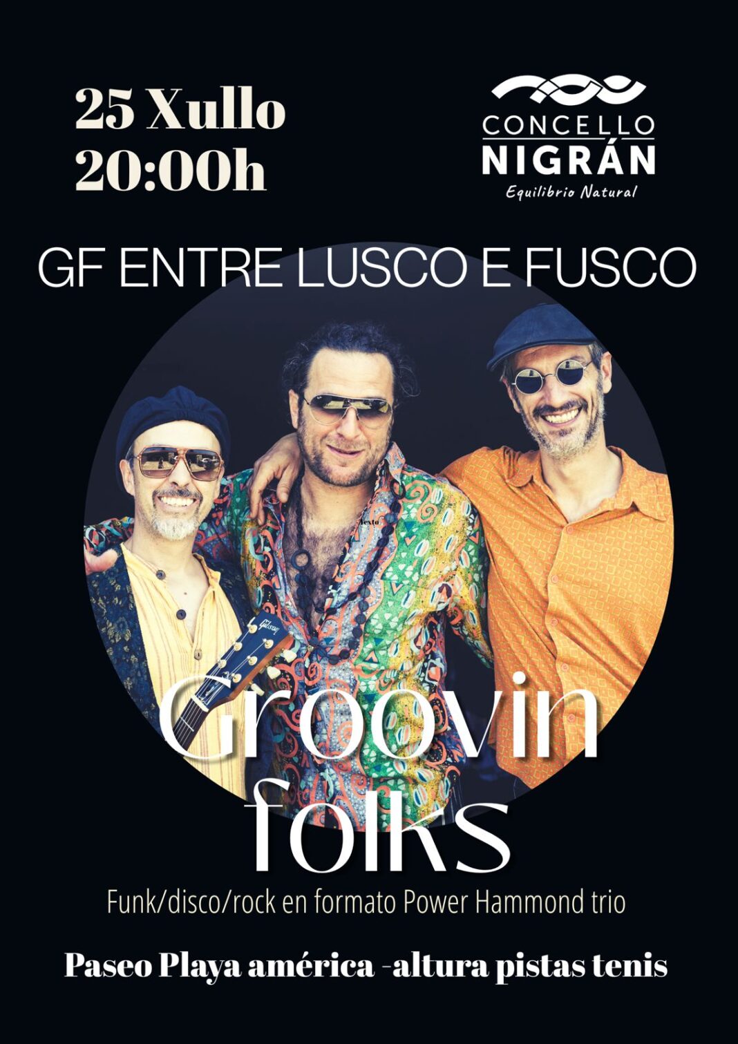 O Concello de Nigrán ofrece este venres 25 de xullo ás 20:00 horas en Praia América (no paseo, á altura das pistas deportivas de Gaifar) o concerto de Groovin Folks. Trátase dun trío nigranés formado por órgano Hammond, guitarra e batería. O conxunto interpreta temas de funk, soul e disco dos anos 60, 70 e 80.