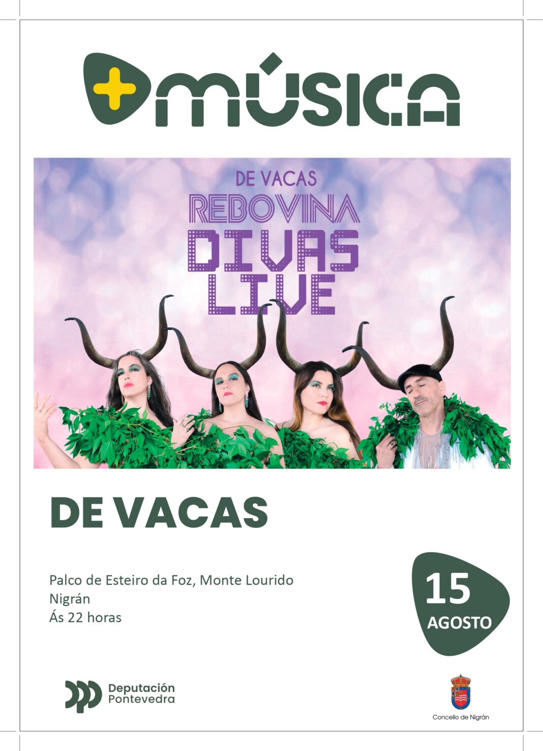 O Concello de Nigrán ofrece este venres 15 de agosto ás 22:00 horas e de xeito gratuíto o concerto de ‘De Vacas’ no escenario ao aire libre do esteiro de A Foz. O cuarteto presenta o seu novo espectáculo ‘Rebovina Divas Life’ coincidindo coa celebración na contorna da festa da cervexa artesana de xoves a domingo. De Vacas son a Marela, a Pinta, a Morena e a Rubia. Son tamén Inés Salvado, Faia Díaz, Paula Romero e o guitarrista nigranés Guillerme Fernández. O divertido cuarteto visita Nigrán a través do programa ‘+ Música’ da Deputación de Pontevedra.