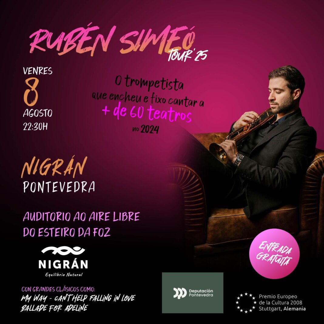 O escenario ao aire libre do esteiro de A Foz acolle este venres 8 de agosto ás 22:30 un dos concertos estrela da programación cultural de verán do Concello de Nigrán: Rubén Simeó, considerado un dos mellores trompetistas clásicos do mundo. Este músico vigués de 32 anos é recoñecido internacionalmente como un dos trompetistas máis virtuosos da súa xeración, facendo historia en 2002, cando se converteu no solista máis novo en tocar no prestixioso Concerto de Aninovo, en Viena. Actualmente Simeó atópase inmerso nunha xira por teatros de todo o mundo, facendo parada en Nigrán para ofrecer o seu concerto máis íntimo e exclusivo ao estar só acompañado por piano e batería. Xuntos interpretarán un repertorio variado no que se poden atopar pezas como ‘My way’, ‘Can´t help falling in love’, ‘Ballade for Adeline’ ou grandes clásicos da música sinfónica. Como sempre, este concerto programado desde o Concello de Nigrán e coa colaboración da Deputación de Pontevedra a través do Plan + Provincia, é con entrada libre.