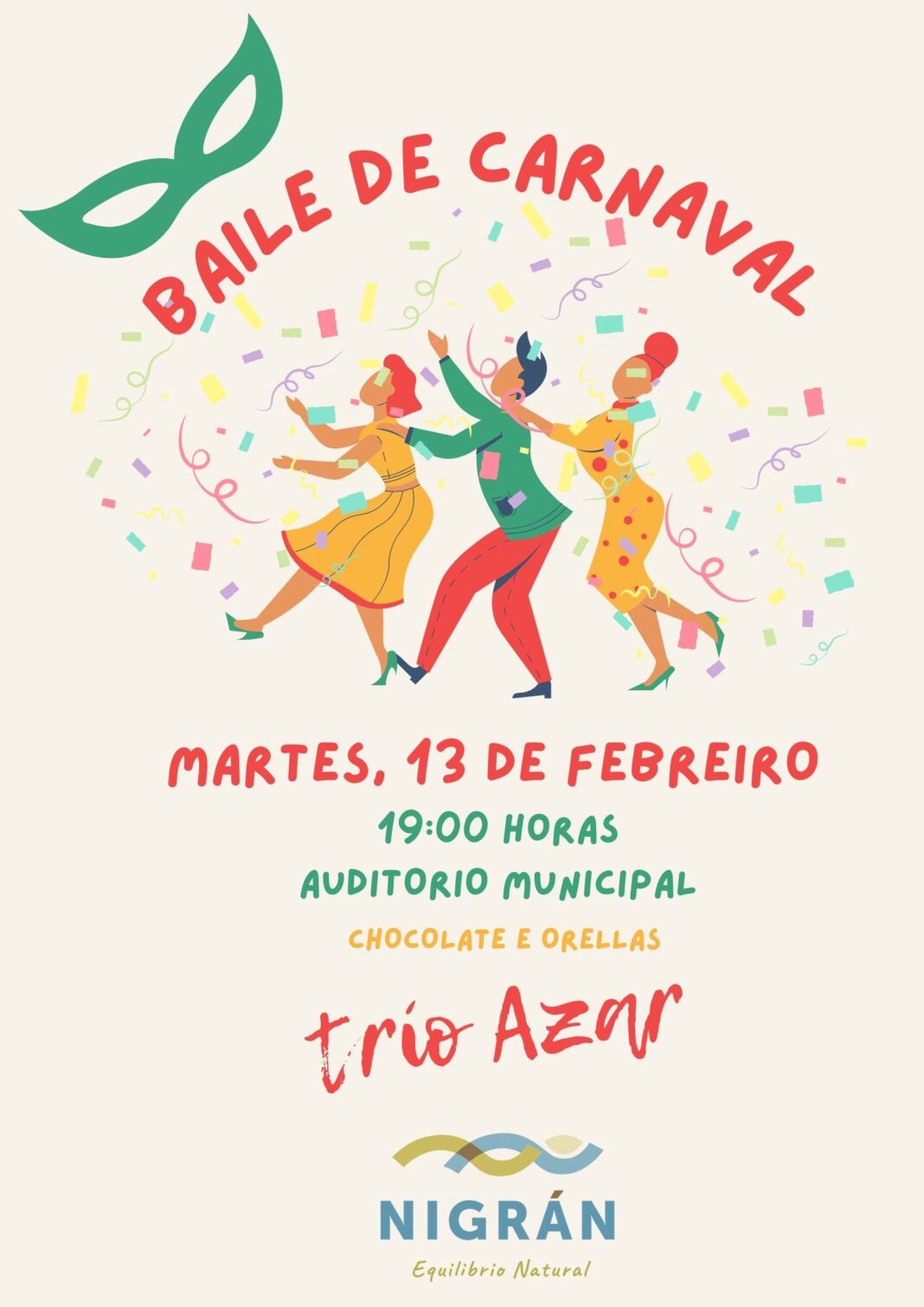 O Concello de Nigrán ofrece este martes 13 de febreiro un baile de carnaval a partir das 19:00 horas no Auditorio Municipal e a música en directo de Trío Azar. Ademais, haberá chocolate e orellas para todos os asistentes. A entrada é de balde ata completar o aforo.