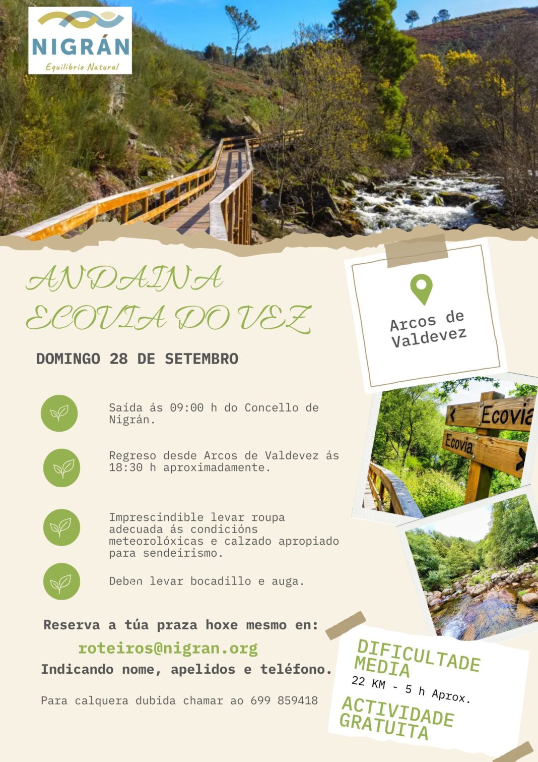 O Concello de Nigrán ofrece o domingo 28 de setembro unha andaina gratuíta de 22 km pola ecovía do Vez, na contorna de Arcos de Valdevez (Portugal). Os interesados en participar deben anotarse previamente en roteiros@nigran.org indicando nome, apelidos e teléfono, tendo prioridade as persoas empadroadas no municipio.