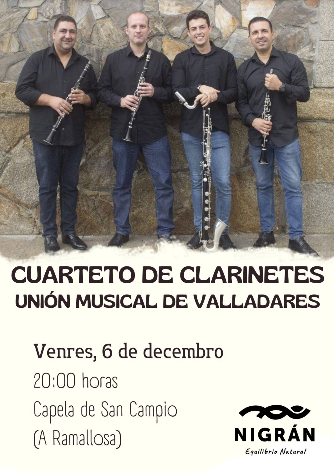 O Concello de Nigrán ofrecerá este venres 6 de decembro o concerto do cuarteto de clarinetes da Unión Musical de Valladares ás 20:00 horas na Capela de San Campio (A Ramallosa). Os intérpretes, César Posada, Miguel García, David Piñeiro e Ignacio Vila darán vida a obras de Nicolo Paganini, Astor Piazzola, Scott Joplin, Beatriz Lockhar e Elena Kats. Trátase do primeiro dos concertos de música de cámara que o Concello ofrecerá durante todo o Nadal en diferentes igrexas do municipio.
