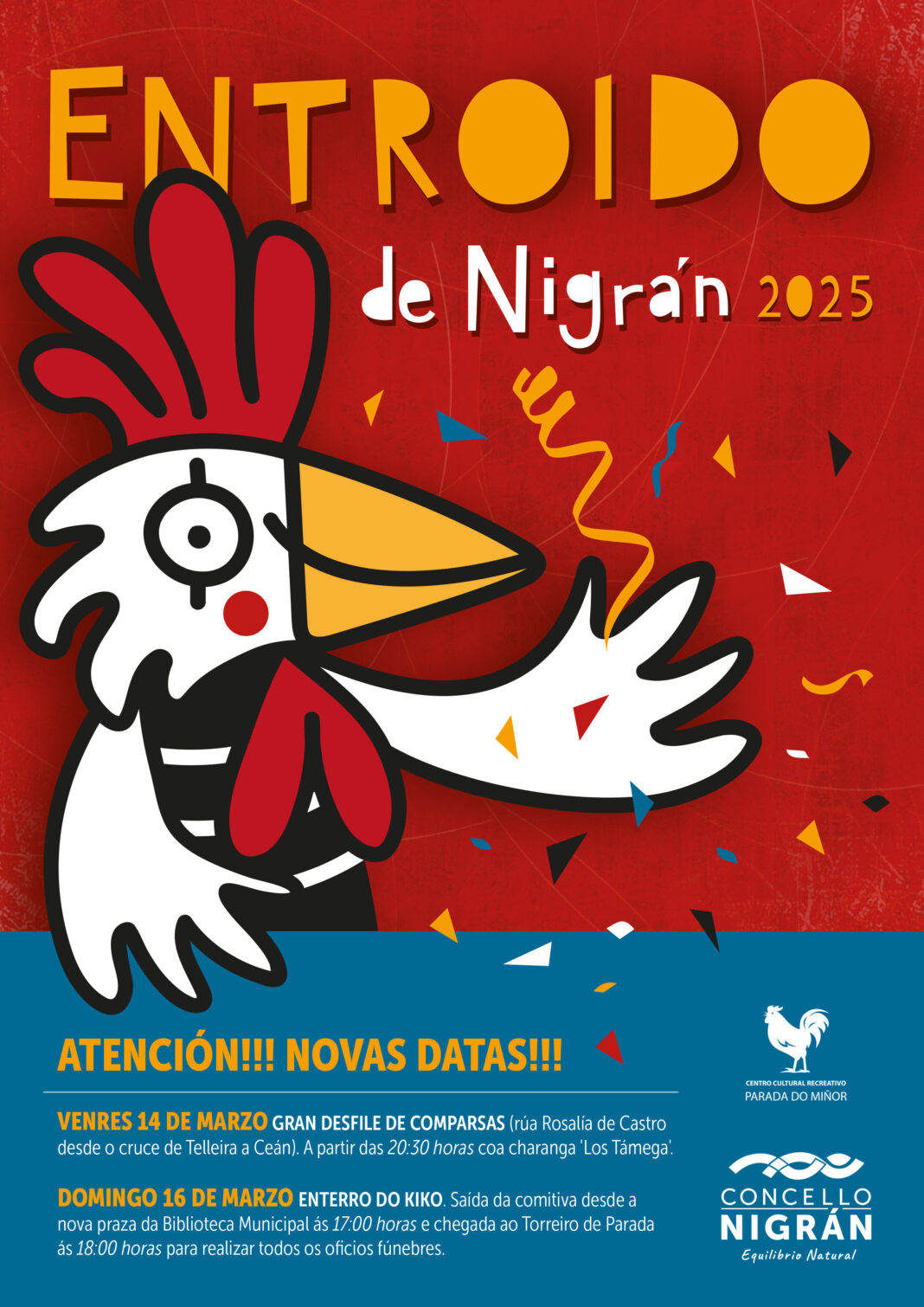 O Concello de Nigrán pecha este domingo 16 de marzo o entroido co tradicional enterro do kiko de Parada que, como novidade, partirá desde a recén remodelada praza da Biblioteca ás 17:00 horas para posteriormente ser velado, sentenciado e incinerado no Torreiro de Parada a partir das 18:00 horas. A comitiva fúnebre estará formada pola charanga VaKPinta e a comparsa de Parada ‘Tri-buhos’, ademáis de por todas aquelas persoas enloitadas que queiran chorar pola morte do kiko.