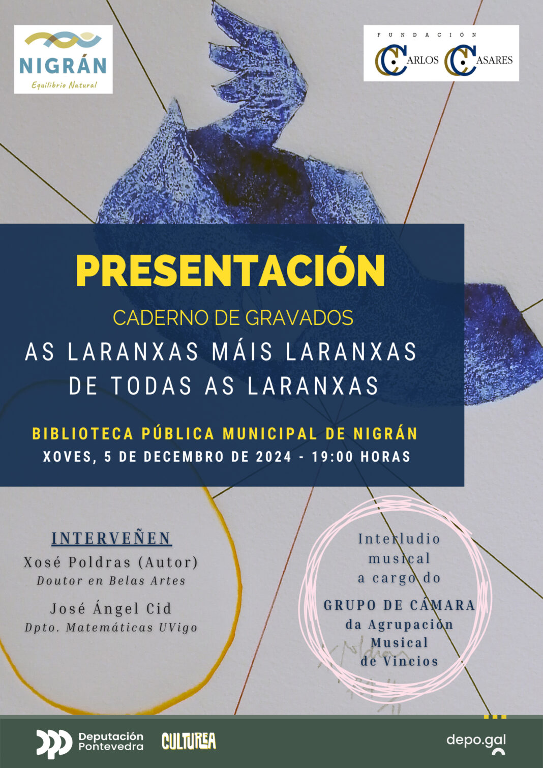 O Concello de Nigrán acolle este xoves 5 de decembro na Biblioteca Municipal ás 19:00 horas a presentación do caderno de gravados de Xosé Poldras ‘As laranxas máis laranxas de todas as laranxas’, título da famosa peza teatral de Carlos Casares, veciño ilustre de Nigrán cuxos restos descansan no cemiterio municipal do Ceán. O acto organizado entre Concello e Fundación Carlos Casares contará coa presenza do autor, Xosé Poldras, e tamén con José Ángel Cid, membro do departamento de Matemáticas da Universidade de Vigo e autor do texto titulado ‘Matemáticas, laranxas e paradoxas’ que contén o caderno, asi coma o rexedor, Juan González, e o edil de Cultura, Roberto Garrido. Na presentación actuará o grupo de cámara da Agrupación Musical de Vincios a través do programa Culturea da Deputación de Pontevedra. A entrada é de balde ata completarse o aforo.
