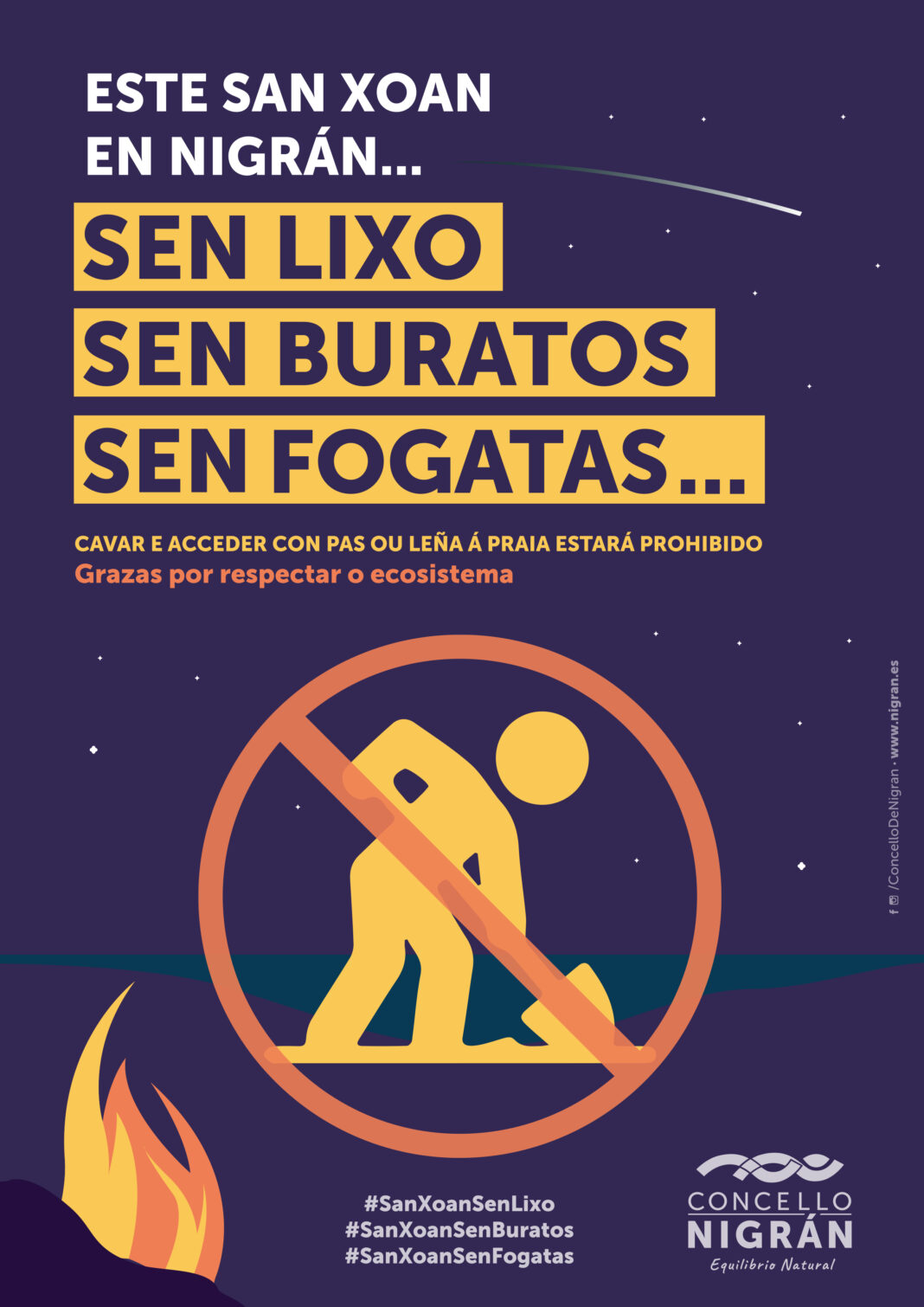“O ano pasado o Concello demostrou que se pode facer unha gran celebración sen afectar ao ecosistema natural, que non está reñido, e non pode haber nin un paso atrás. Estamos a crear unha nova conciencia social ao respecto da festa de San Xoan, tanto que estamos seguros de que nuns anos nin sequera fará falta realizar a campaña #SanXoanSenLixo”, sinala o alcalde, Juan González, en referencia á cartalería, cuñas en radio e publicidade que apela á ciddanía a facer unha festa responsable. Neste sentido, novamente estará operativo un equipo de concienciación ambiental a pé de praia recordando aos asistentes as obrigas que conleva o respecto dun espazo natural (mensaxe que se repetirá tamén por megafonía). Eles mesmos entregaranlle aos diferentes grupos sacos para que depositen o seu lixo nos contedores habilitados nos accesos. “Realmente, o importante é que os asistentes saiban con anterioridade que o día de San Xoan non van poder acceder á praia con pás, sachos, leña ou material contundente, polo que pedimos a colaboración de toda a veciñanza na difusión da mensaxe”, incide González.