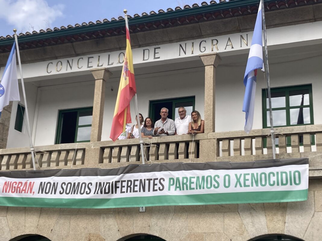 ‘Nigrán, non somos indiferentes. Paremos o xenocidio’ é o lema escollido para a pancarta pendurada desde hoxe na fachada da Casa Consistorial e para as pulseiras que se repartirán entre a veciñanza
