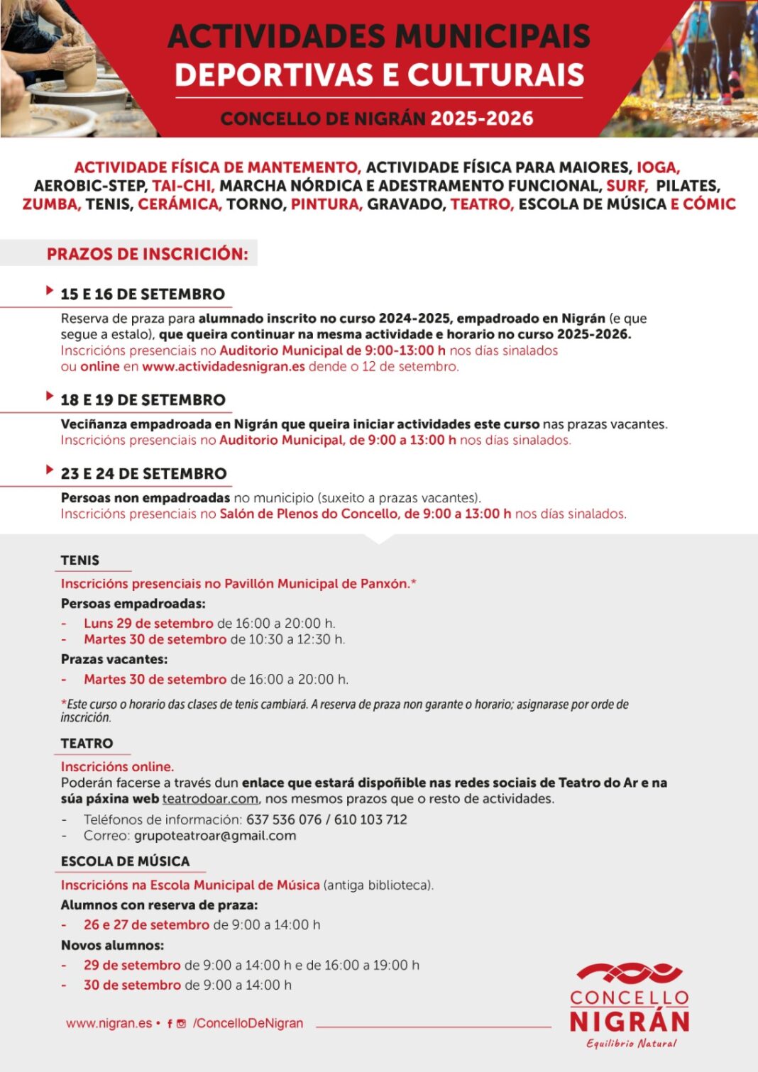 O alumnado empadroado en Nigrán que cursara unha actividade neste curso pasado ten a praza reservada no mesmo horario e, se desexa continuar sen cambios, pode formalizada xa online na web www.actividadesnigran.es ou presencialmente o 15 e 16 de setembro no Auditorio Municipal de 9:00 a 13:00 horas. As excepcións son tenis, que se debe facer presencialmente no Pavillón de Panxón (29 e 30 de setembro); teatro, na web de Teatro do Ar e nun link nas súas redes sociais; e música cos seus propios prazos e novidades a partir do 26 de setembro.