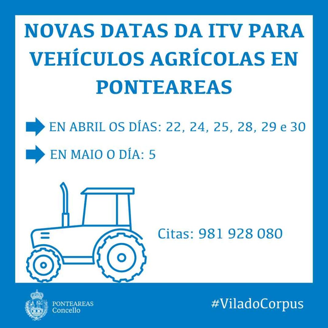 O Concello de Ponteareas informa das novas datas do servizo de ITV móbil para vehículos agrícolas. O tenente de alcaldesa e concelleiro de Seguridade Cidadá e Tráfico, Juan Carlos González, salienta a importancia de contar con este servizo que evita desprazamentos fóra do municipio reducindo a perigosidade que iso implica tanto para a seguridade viaria como para os propios vehículos agrícolas.