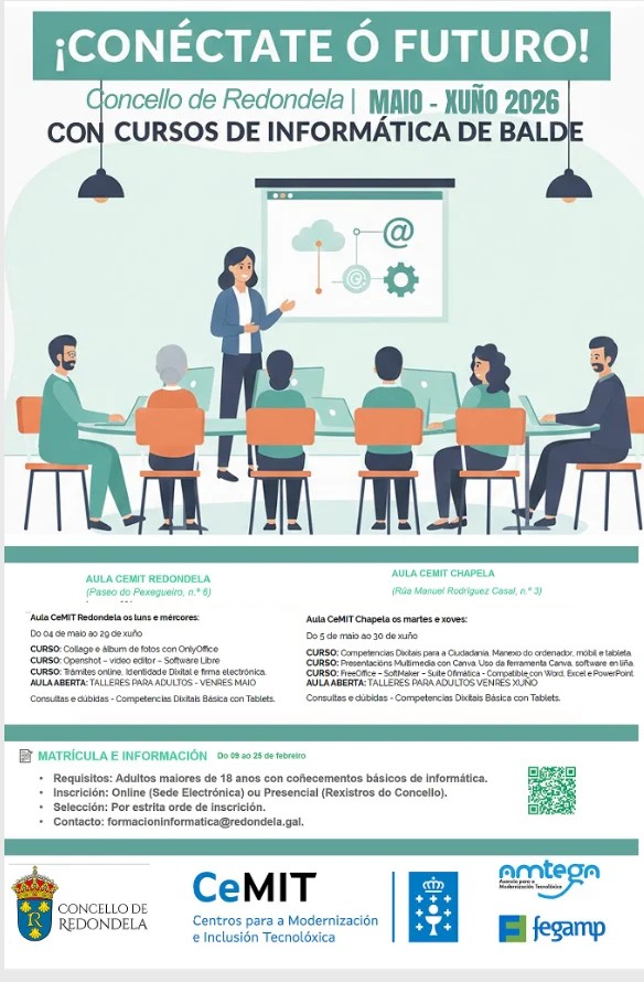 A Concellería de Novas Tecnoloxías, que dirixe Antonio Cabaleiro, desenvolverá durante os meses de maio e xuño cursos totalmente gratuítos dirixidos ao público en xeral. A formación impartirase nas Aulas CeMIT de Redondela e Chapela e abarcan diferentes ámbitos da informática. Para estes cursos ofértanse máis de 100 prazas en diferentes horarios. Cabaleiro explica que o obxectivo é “facilitar a formación dos veciños e veciñas nun sector que está en continuo crecemento” así como promover a alfabetización dixital entre a poboación maior “que ten máis dificultades no mundo tecnolóxico”, explica Cabaleiro. As formacións son as seguintes: