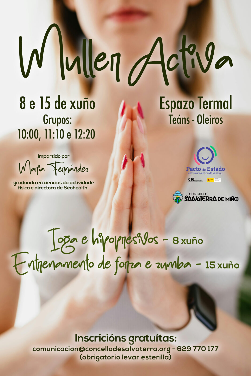 Nesta ocasión lanza Muller Activa, un programa de actividades ó aire libre no Espazo Termal de Teáns Oleiros dirixido a mulleres o cal se levará a cabo en dúas xornadas. A primeira o 8 de xuño será de ioga e hipopresivos e a segunda o 15 de xuño un entrenamento de forza e zumba.