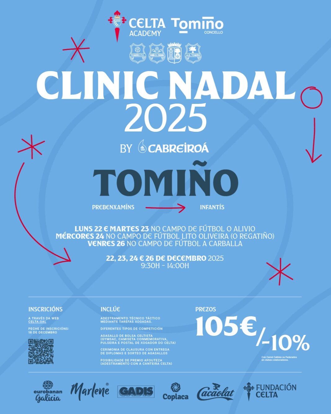 O Concello de Tomiño, en colaboración coa Fundación RC Celta, pon en marcha a primeira edición do Clinic de Nadal 2025 no municipio, unha iniciativa que combina deporte, diversión e aprendizaxe durante as vacacións escolares. Esta actividade forma parte dunha nova liña de colaboracións estratéxicas entre o Concello e o RC Celta, que se irán anunciando ao longo do ano, co obxectivo de ampliar as oportunidades deportivas, educativas e sociais para a mocidade do municipio, promovendo hábitos saudables, valores de equipo e formación integral a través do deporte.