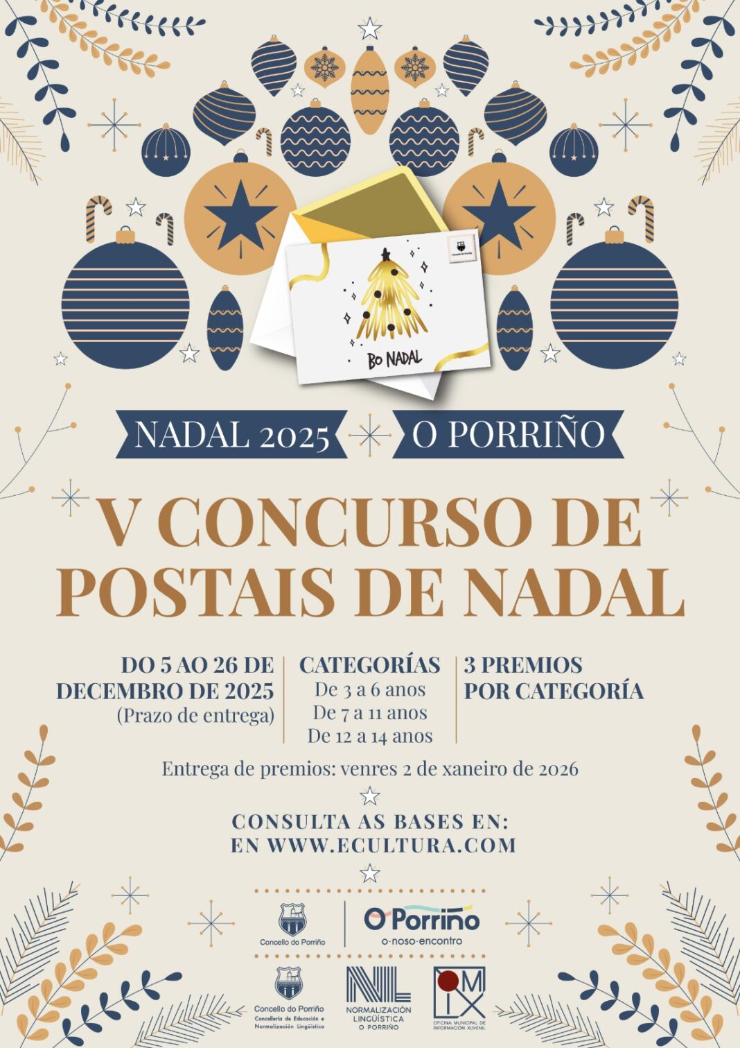 O Concello do Porriño, a través da Concellería de Educación e Normalización Lingüística, xunto coa OMIX, vén de anunciar a posta en marcha do V Concurso Infantil de Postais de Nadal, unha iniciativa dirixida a toda a infancia porriñesa de entre 3 e 14 anos, coa finalidade de promover a creatividade, a expresión artística e o uso da lingua galega nestas datas tan especiais.