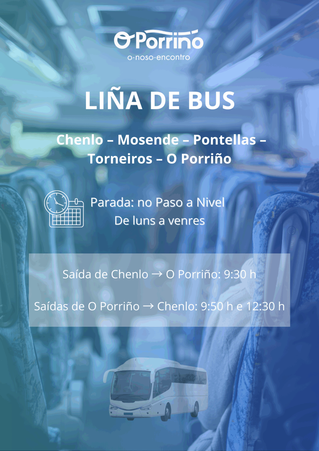 Os horarios da liña manteranse como ata o de agora, de luns a venres, con saída desde Chenlo cara ao Porriño ás 9:30 horas, e con saídas desde o Porriño con destino a Chenlo ás 9:50 horas e ás 12:30 horas.