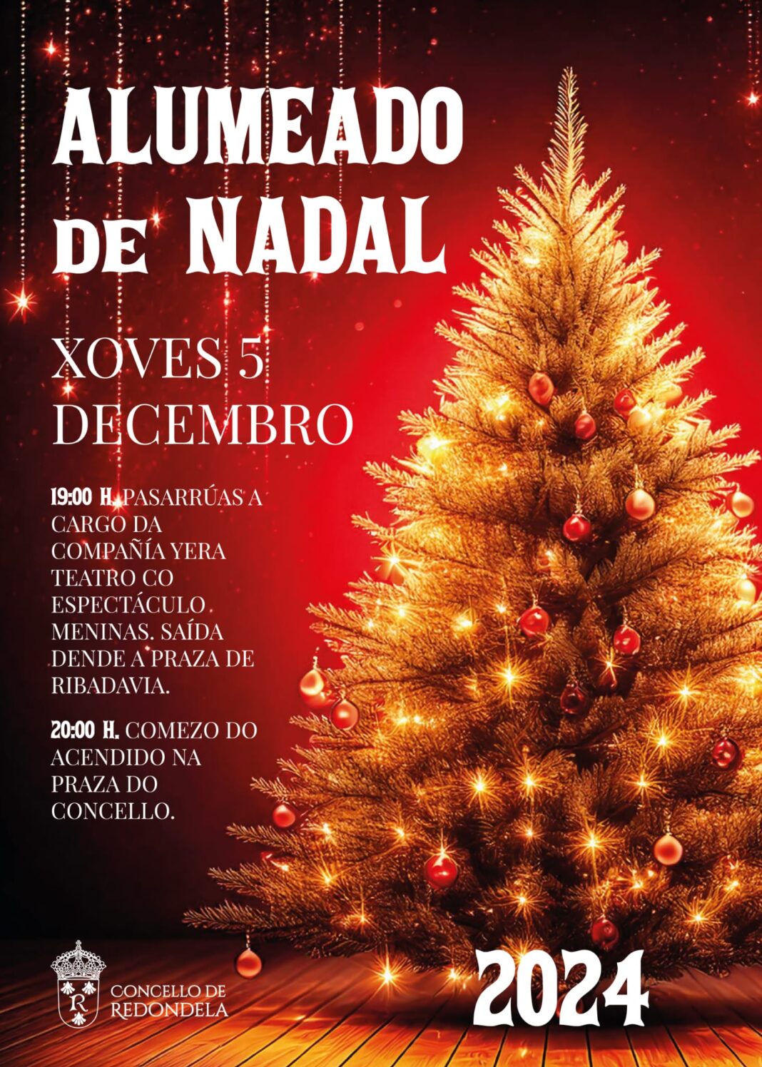 Redondela celebra o vindeiro xoves, 5 de decembro, o acendido das luces de Nadal cun gran espectáculo. A praza do Concello e as rúas do centro da vila acollerán o pasarrúas “Meninas”, da compañía Yera Teatro desde as 19.00 horas. Trátase dunha proposta espectacular con marionetas xigantes, a estética lembra aos traxes de época con grandes cadeiras, tipo “Menina”, cun acompañamento musical creado para a ocasión. “Unha aposta moi creativa que vai conectar co público de todas as idades”, sinala a concelleira de Cultura, Rita Pérez Táboas. O percorrido deste espectáculo itinerante comezará na Praza de Ribadavia. A Coca Simona será outra das protagonistas da xornada, acompañando o pasarrúas e facendo as delicias dos nenos e nenas.