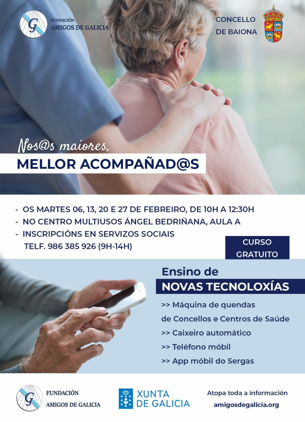 O Concello de Baiona e a Fundación Amigos de Galicia poñen en marcha o programa «Mellor acompañados», co obxectivo de fomentar a autonomía e a independencia das persoas maiores de Baiona. Inclúe catro formacións de 2.30 horas sobre as máquinas de quendas, a aplicación móbil do Sergas, o caixeiro automático ou o teléfono móbil. O programa desenvolverase os martes de febreiro (06,13,2 e 27 de febreiro) de 10H a 12:30H no Centro Multiusos Ángel Bedriñana situada na Rúa Carabela Pinta.