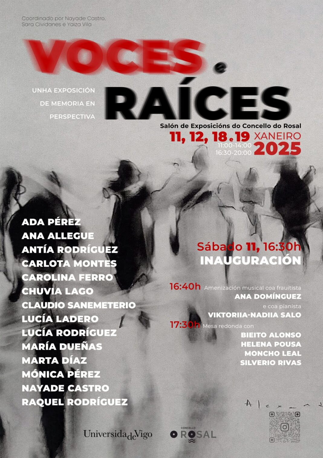 ‘Voces e raíces’ recolle o traballo de 14 artistas que a través de obras pictóricas, fotografías, creacións audiovisuais ou fancines afondan sobre a memoria como concepto, combinando perspectivas íntimas e colectivas. Deste xeito, o público poderá ver a obra de Ada Pérez, Ana Llegue, Antía Rodríguez, Carlota Montes, Carolina Ferro, Chuvia Lago, Claudio Sanemetrio, Lucía Ladero, Lucía Rodríguez, María Dueñas, Marta Díaz, Mónica Pérez, Raquel Rodríguez e a propia Nayade Castro.